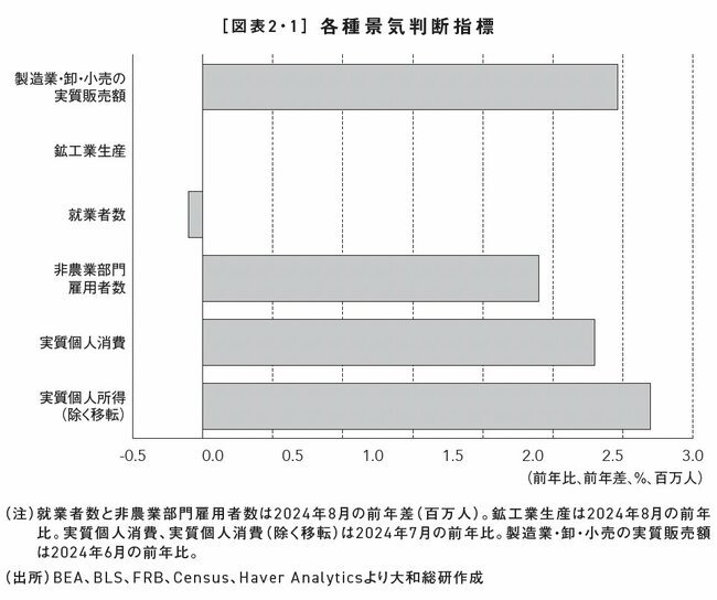 足元のこれらの経済指標を見ると、就業者数は前年比で小幅にマイナス、鉱工業生産は前年比で横ばいとなっているものの、それ以外の4指標はプラスを維持しており、米国経済は景気後退からは依然として距離があるといえる。