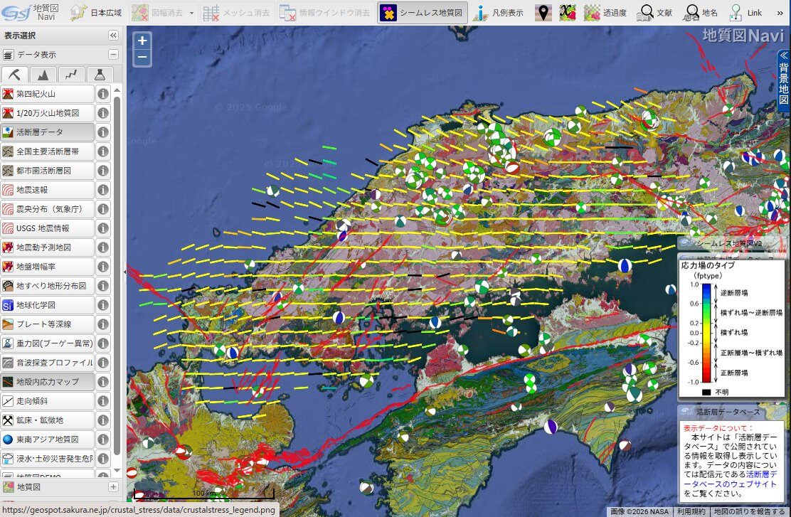 브라타모리도 방문한 적이 있는, 츠쿠바시 등에 거점을 가지는 국립 연구 개발 법인·산총연은, 지진이나 활단층등의 데이터를 공개하고 있습니다. 지질도 네비> 데이터 표시 > 지각내응력 맵으로 진행하면 위의 표시가 나옵니다.