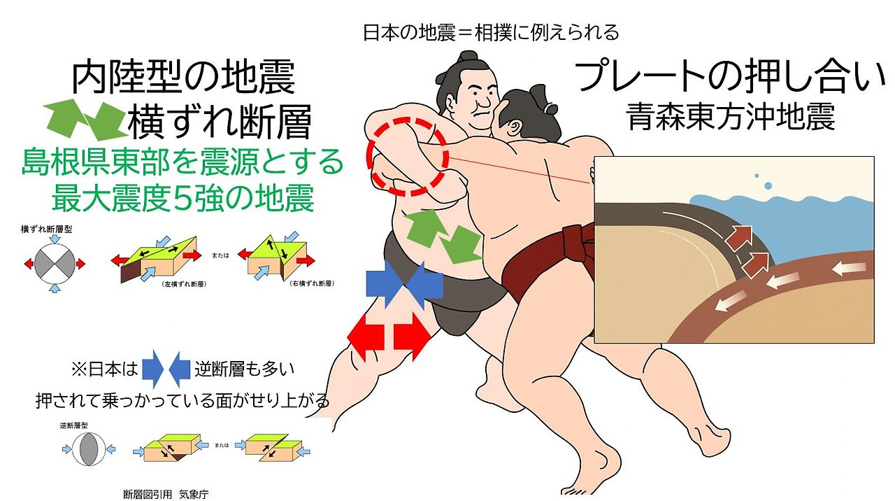今回の島根県東部を震源とする最大震度5強の地震や後続の地震も、内陸型の断層による地震にあたります。