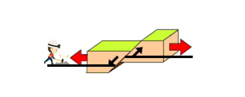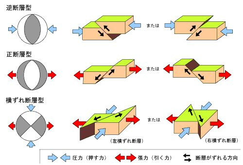 これを機にもう1つ押さえておくなら、2番目に多い逆断層。日本はプレートの狭間にありぎゅうぎゅう押される力が強く逆断層が発生しやすくなります。両側から押され、乗っかっている面がせり上がると覚えておくとよいです。
