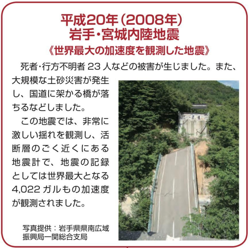 ※お住いの地区の断層(正確には地殻内応力)は、地質図ナビで確認できますが、表示が少ない地域では巨大なプレート境界が支配的で内陸断層の存在が地図上で目立ちにくいだけで、有数の活断層帯を抱えていることがあります。例えば2008年に起きた岩手・宮城内陸地震は断層型で、23名の死者・行方不明者、426名の負傷者を出しています。