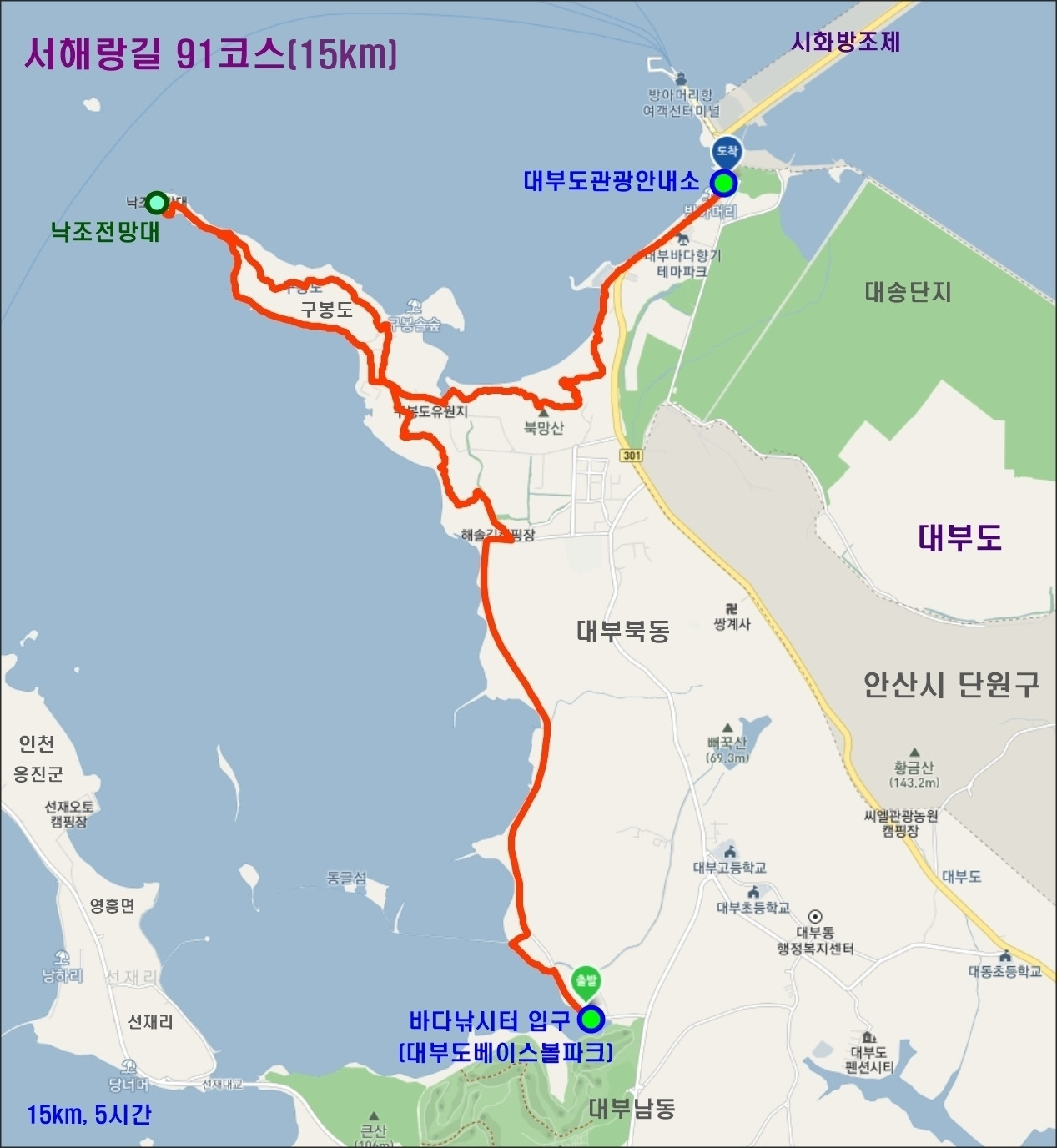 [대부도관광안내소-북망산-구봉도 낙조전망대-돈지섬-바구리방조제-상동람사르습지전망대-독도바다낚시터-더헤븐CC-큰산-흥성리선착장-핀란드카라반-젤리캠핑장-오캠핑장-고래숲관광농원-해바다팬션-고랫부리입구정류장]
