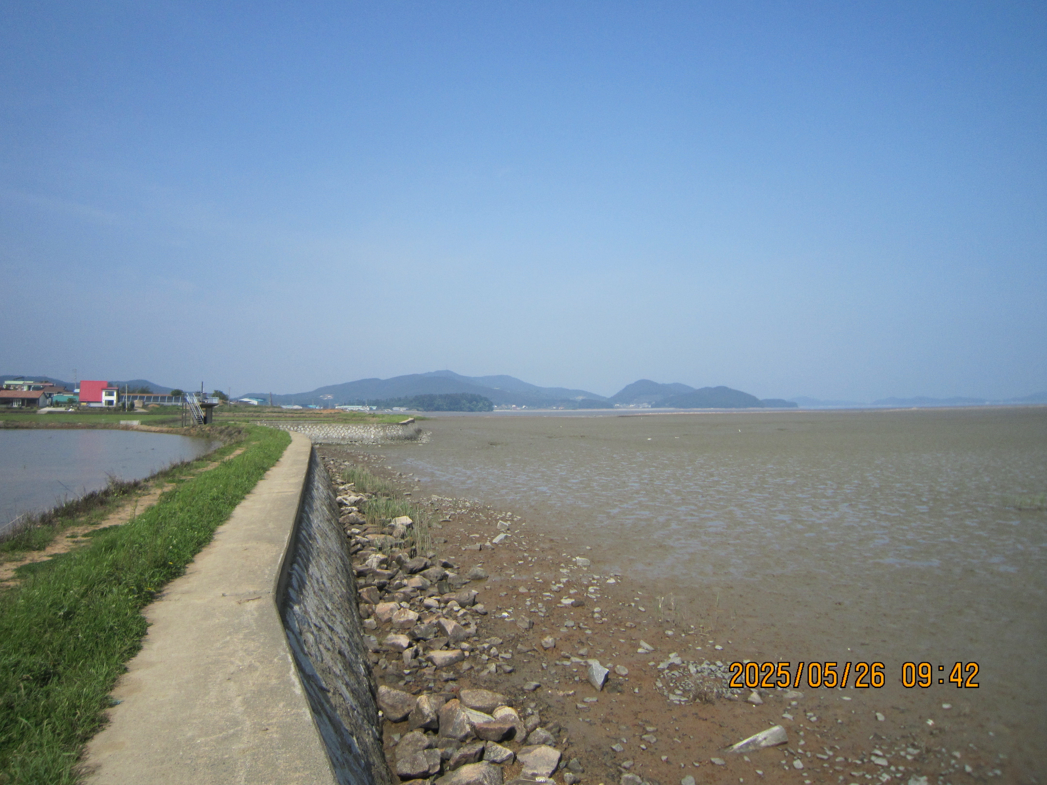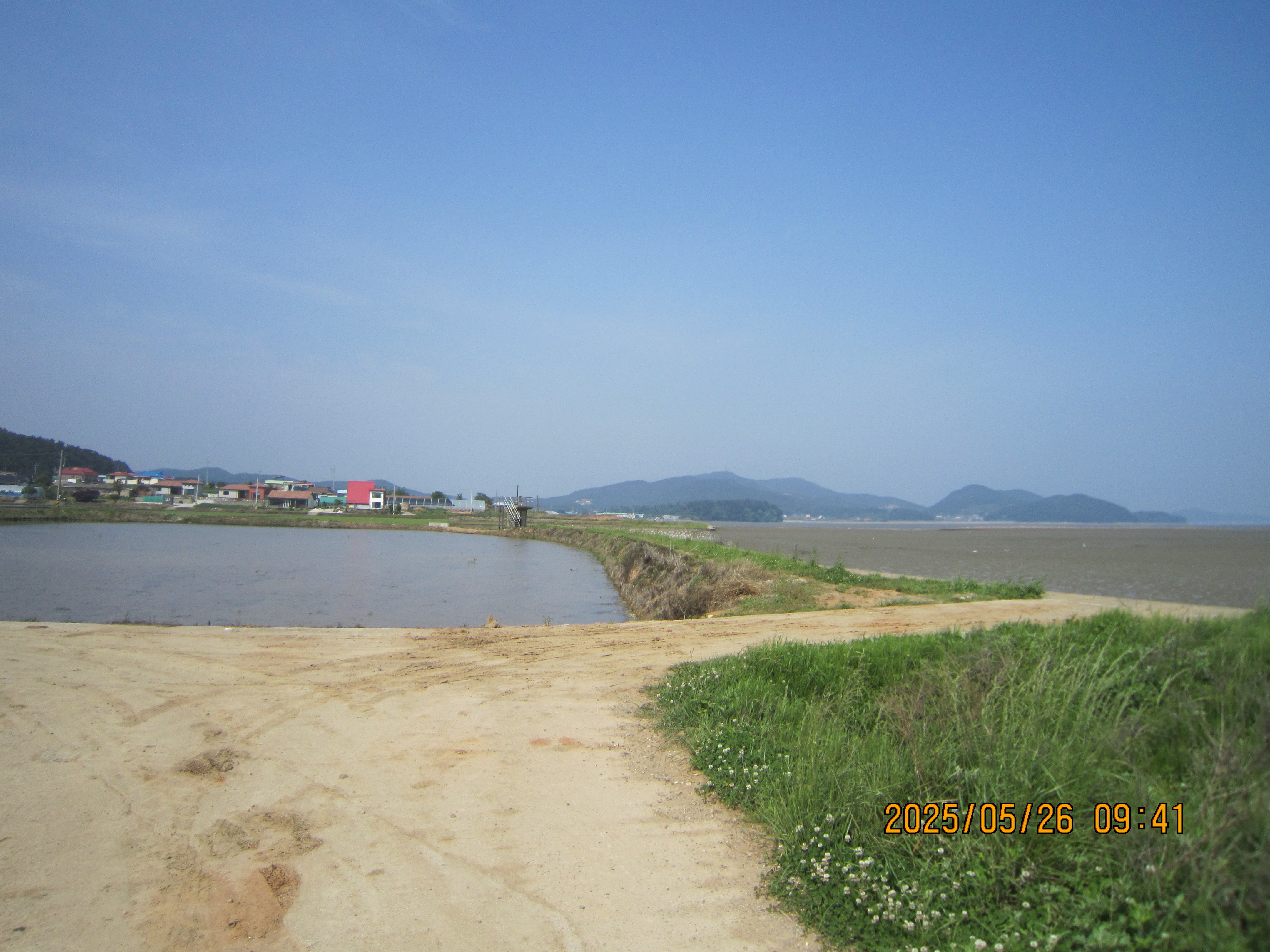 -09:37 해변제방밑 좌측 구 마니수산앞을 지나 제방길로 진행하며 금북정맥끝자락 지령산등 조망후,