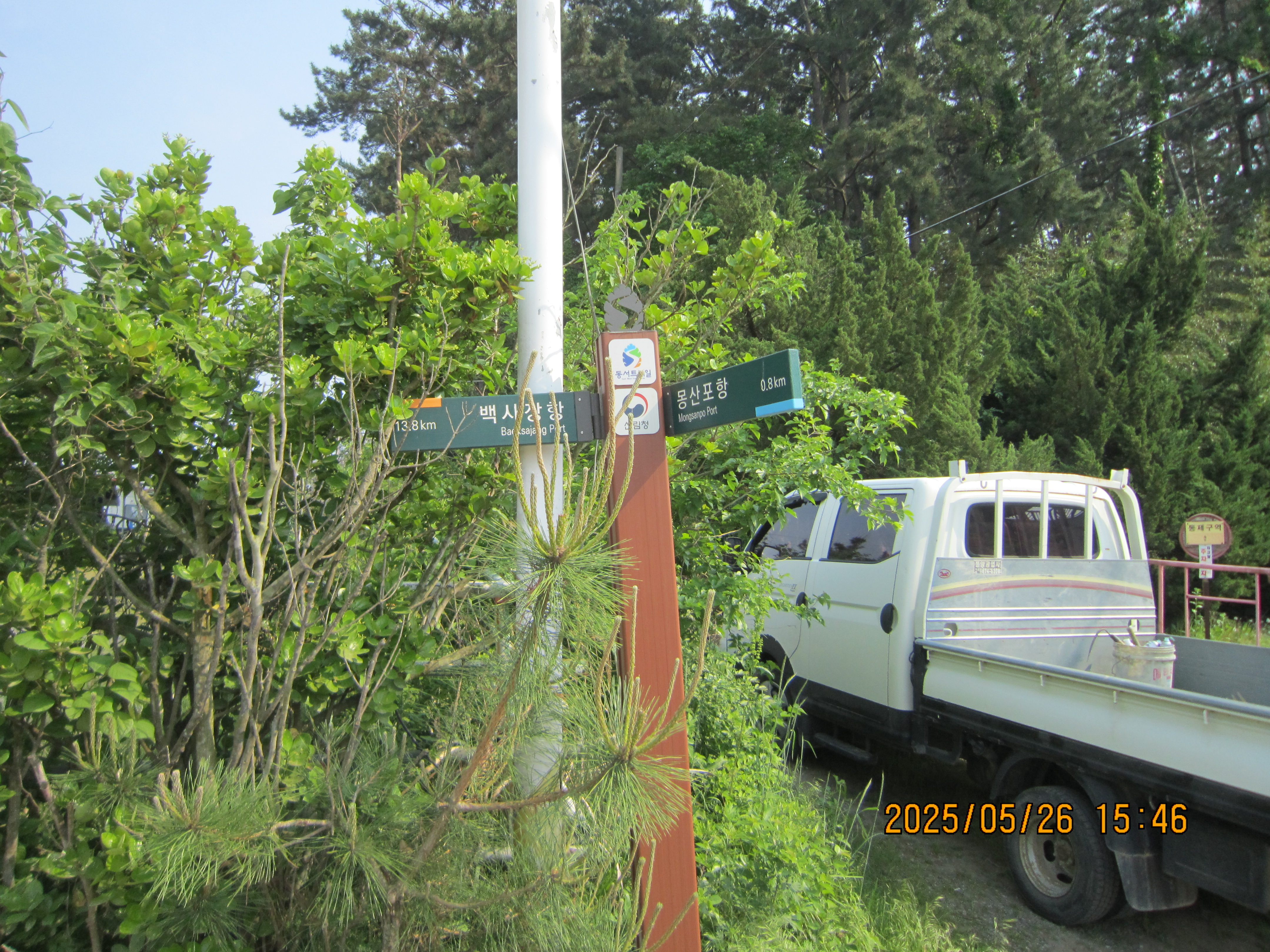 -16:00 주차장,탐방지원센터교차로, CU우측 이정표 →백사장항 13.5Km우회