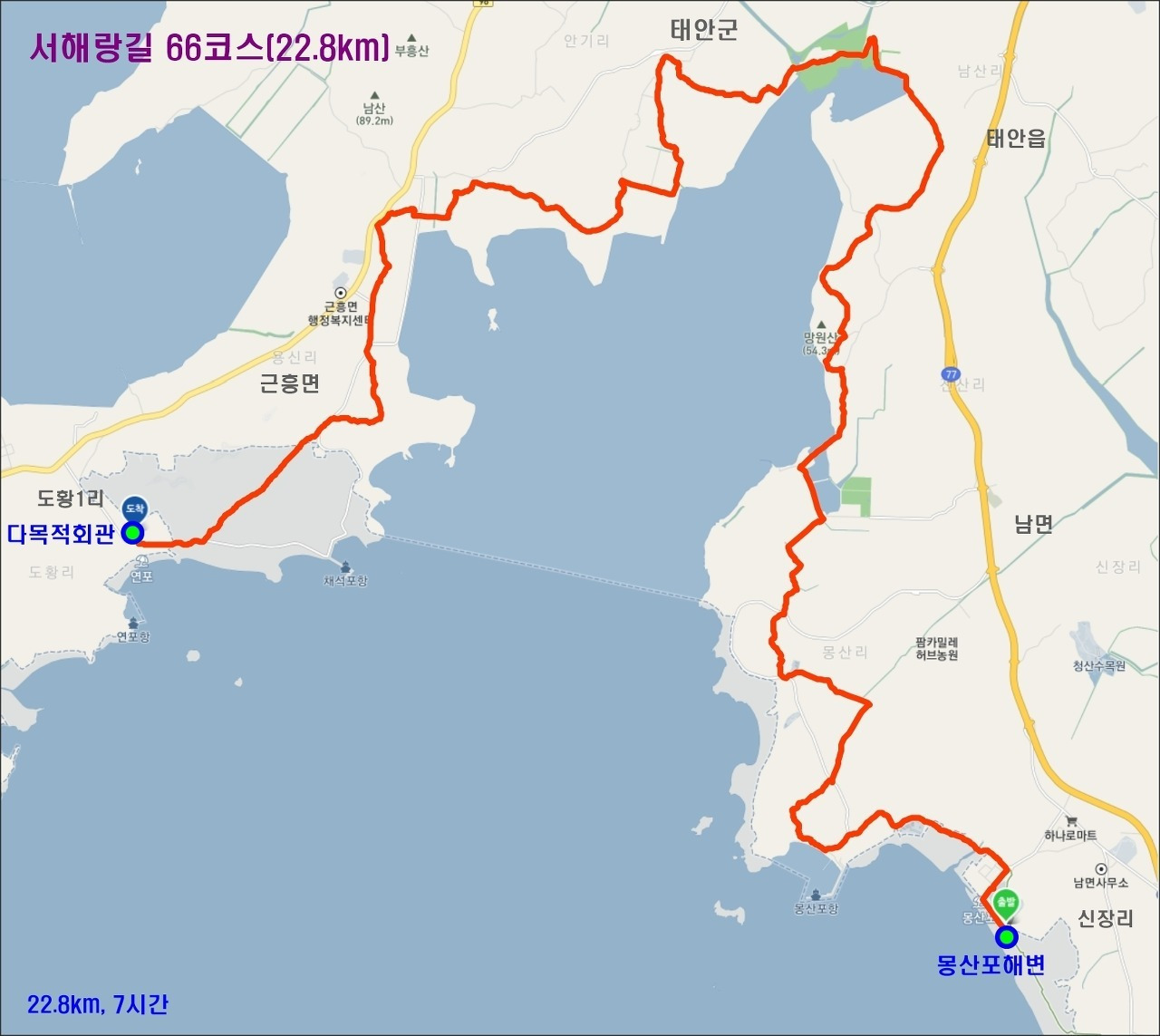 [신대삼거리-도황경로당-도황2리회관-아랫황골-도황1리회관-용새골-태안좌동교회-천앙골-각골-용뿌리-평화염전-진벌-개천염전-소목골-몽대-몽산포해변]