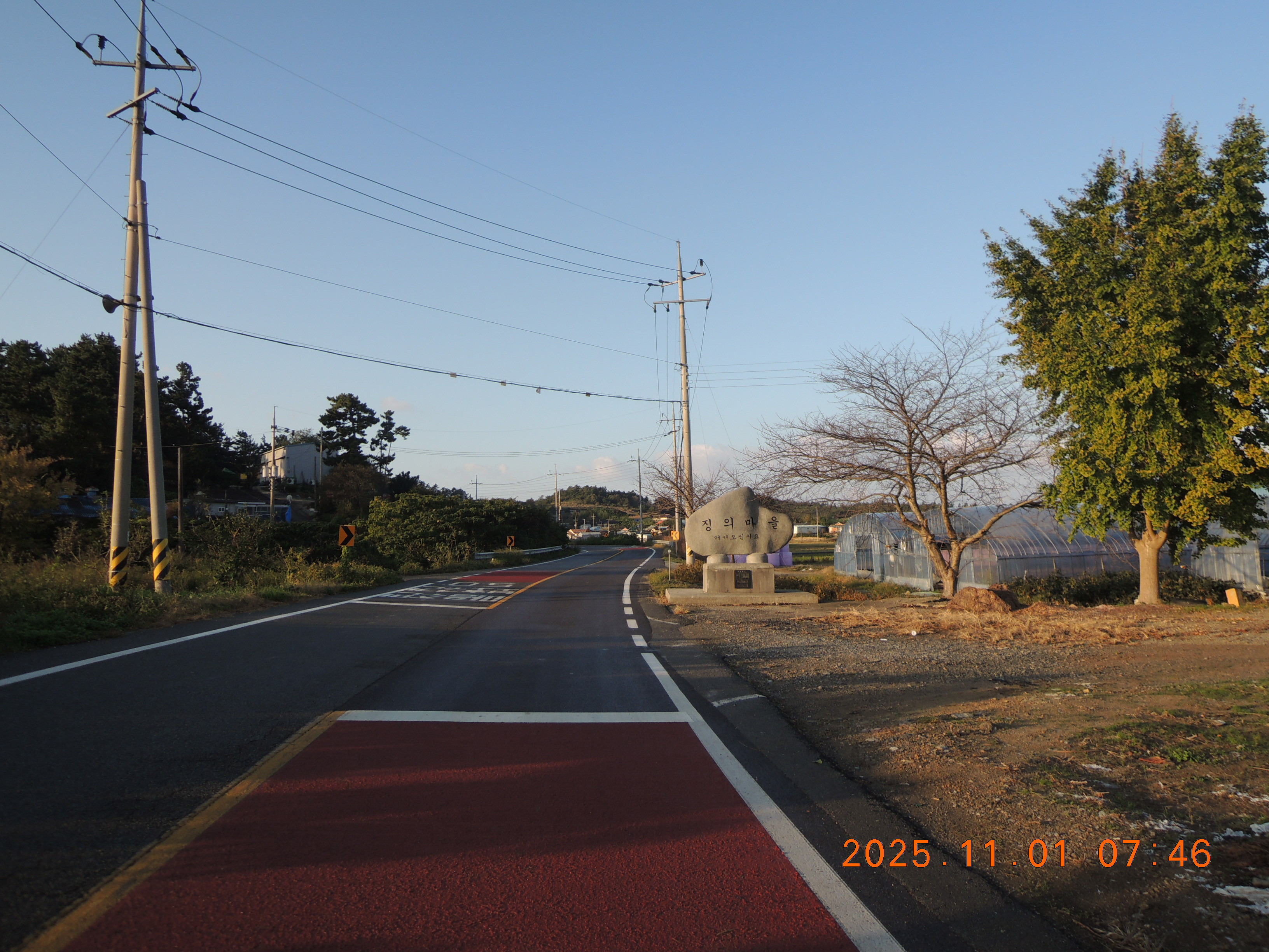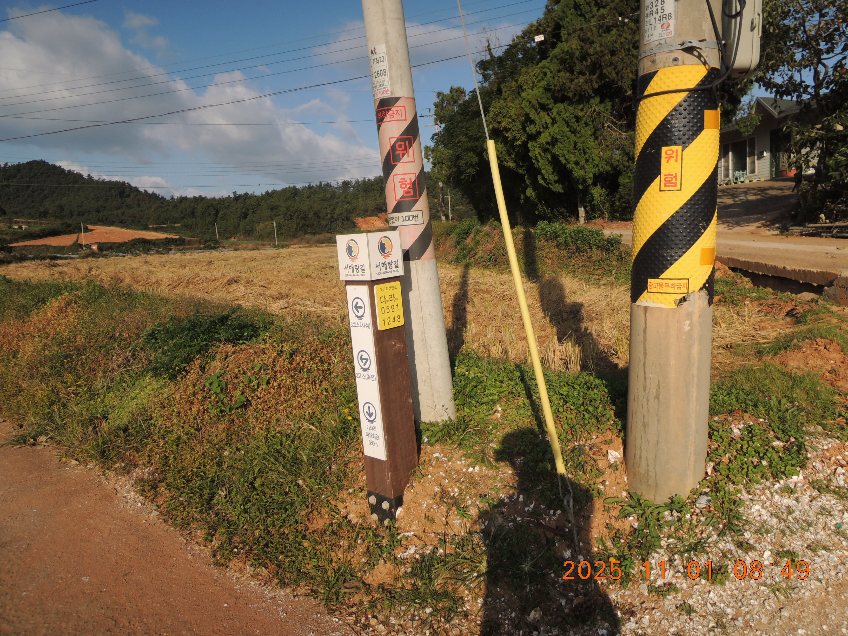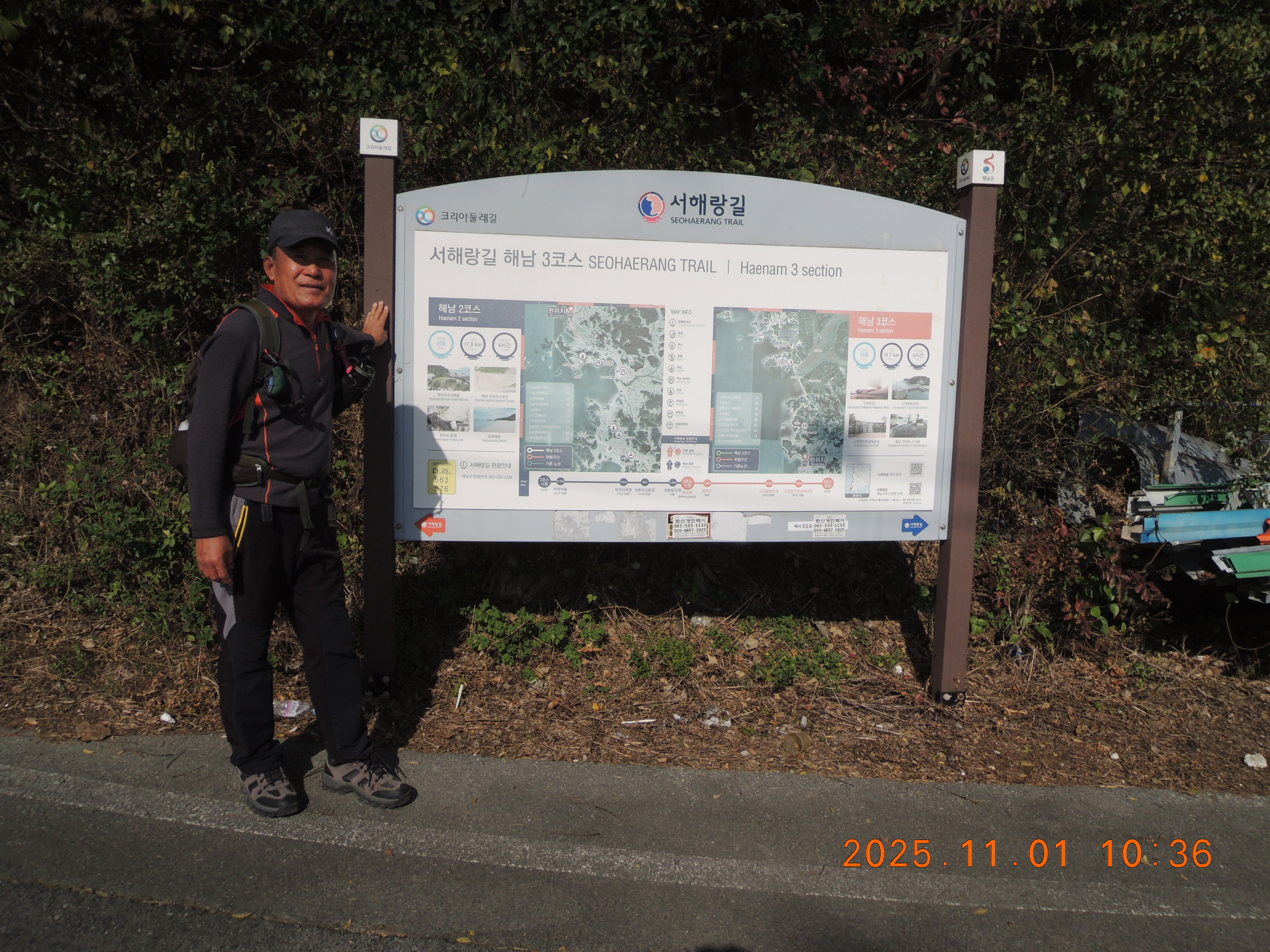 ※도착후 약한비가 내리고 버스정류장 좌측 도로 건너편에 서해랑길 해남 4코스 종점/5코스 시점 안내판 확인후, 도로따라 약 100여m 진행하다 이정목, 마을길로 우회.