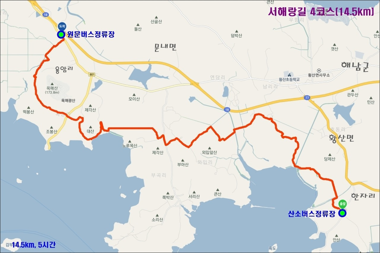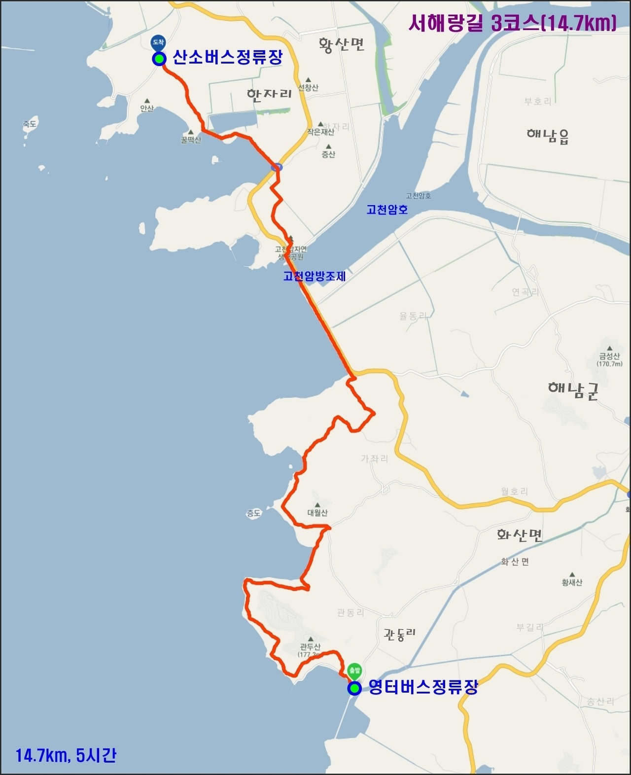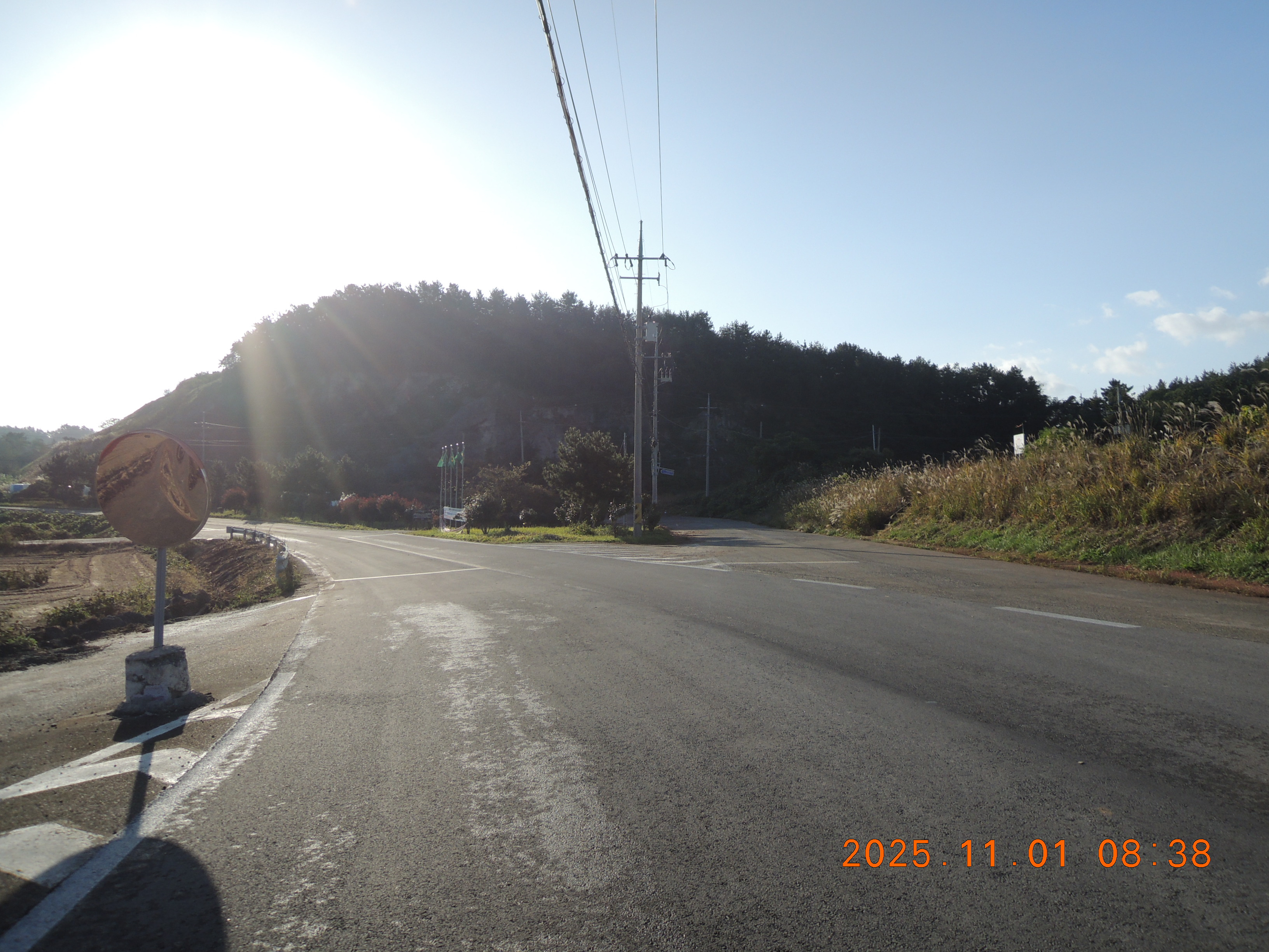 ※도착후 약한비가 내리고 버스정류장 좌측 도로 건너편에 서해랑길 해남 4코스 종점/5코스 시점 안내판 확인후, 도로따라 약 100여m 진행하다 이정목, 마을길로 우회.