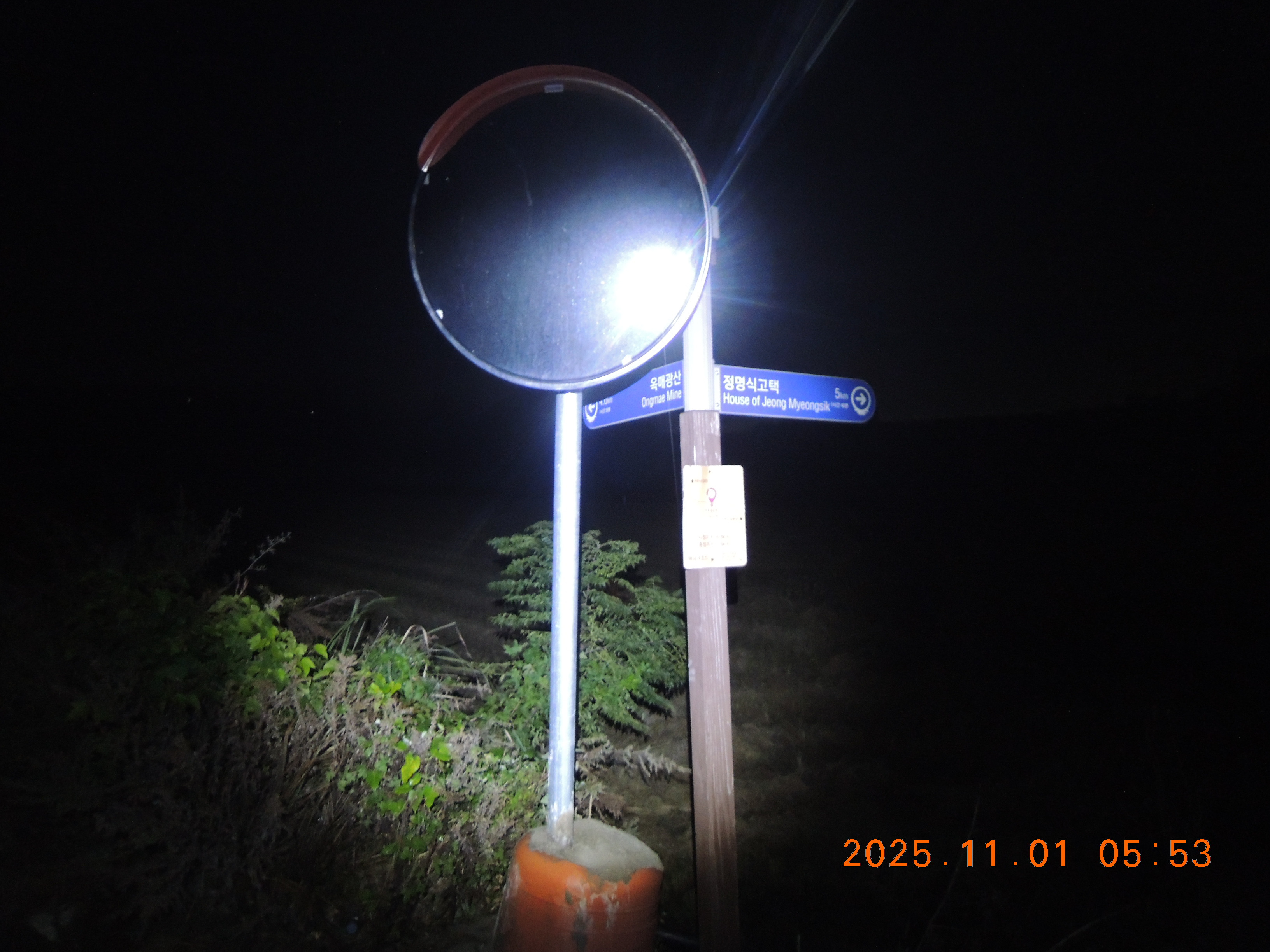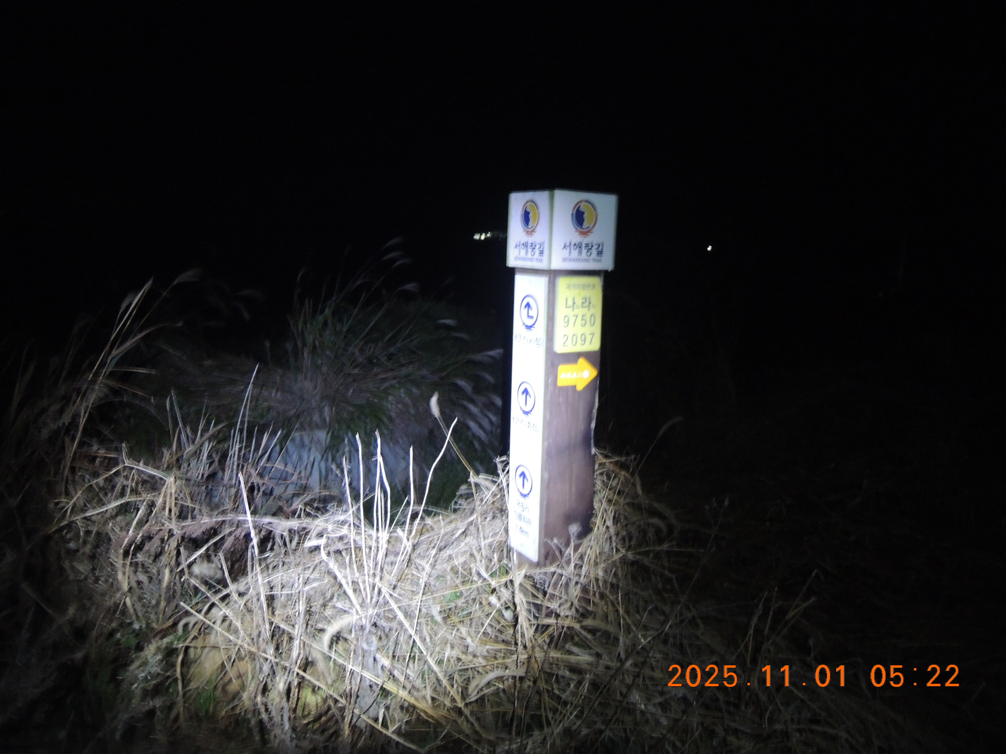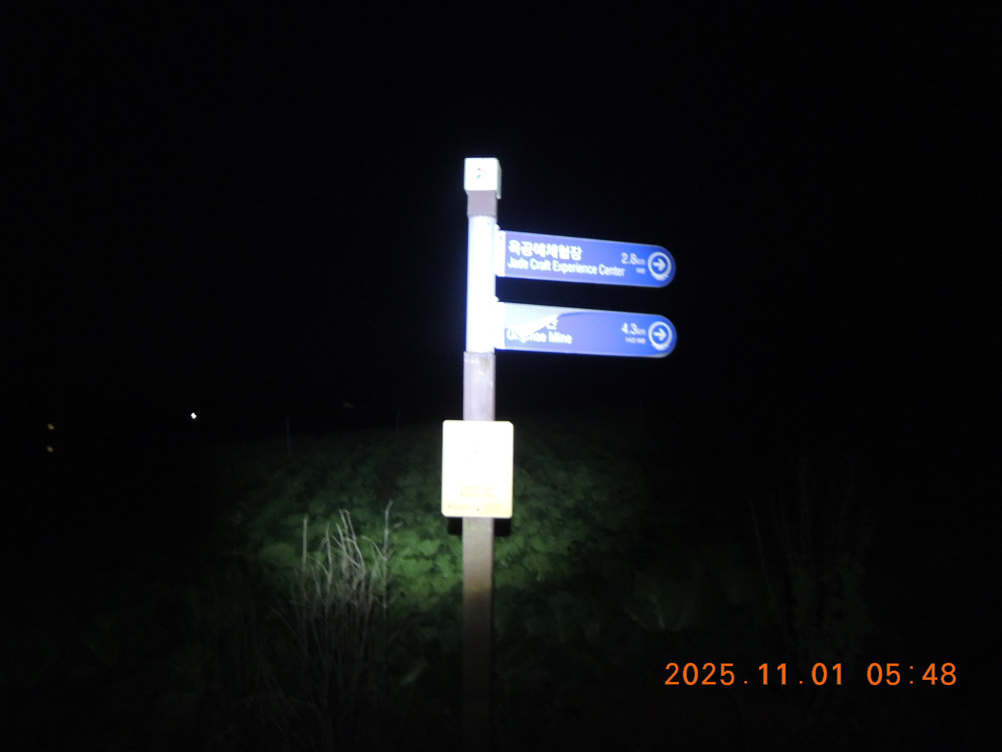 -05:22 축사 전, 이정목 우측으로 꺽어 농로시멘트길 수로다리 건너 진행.