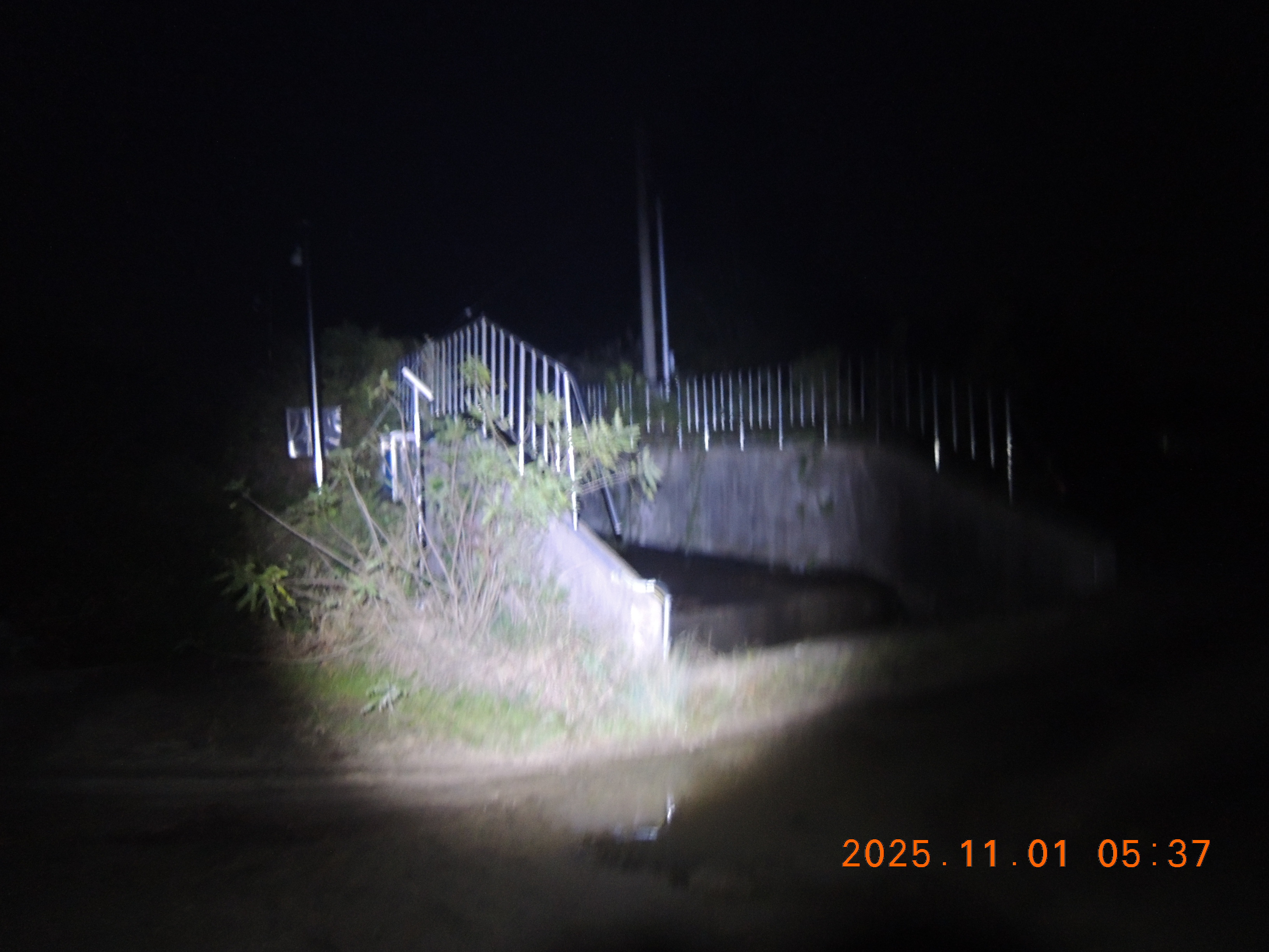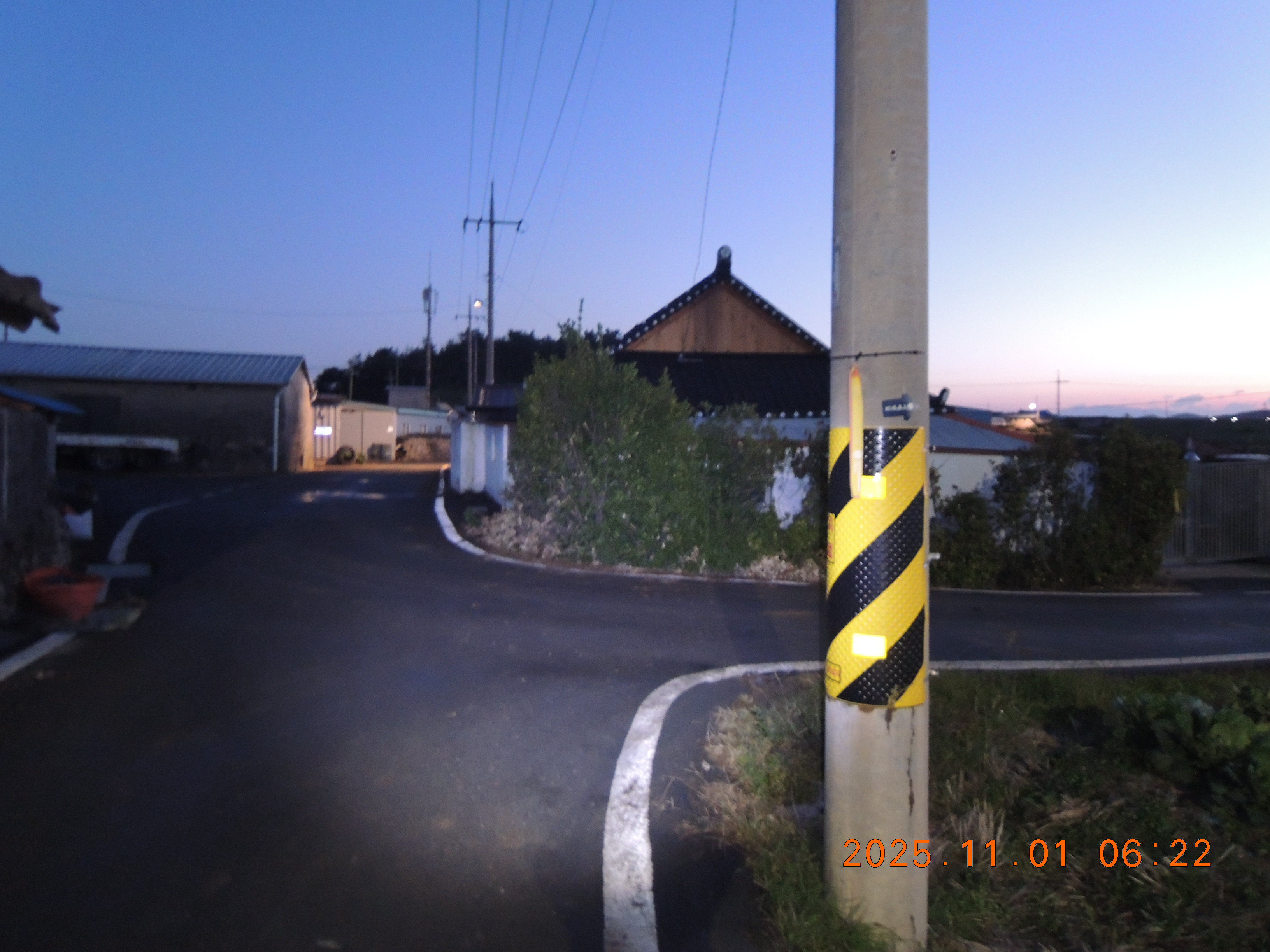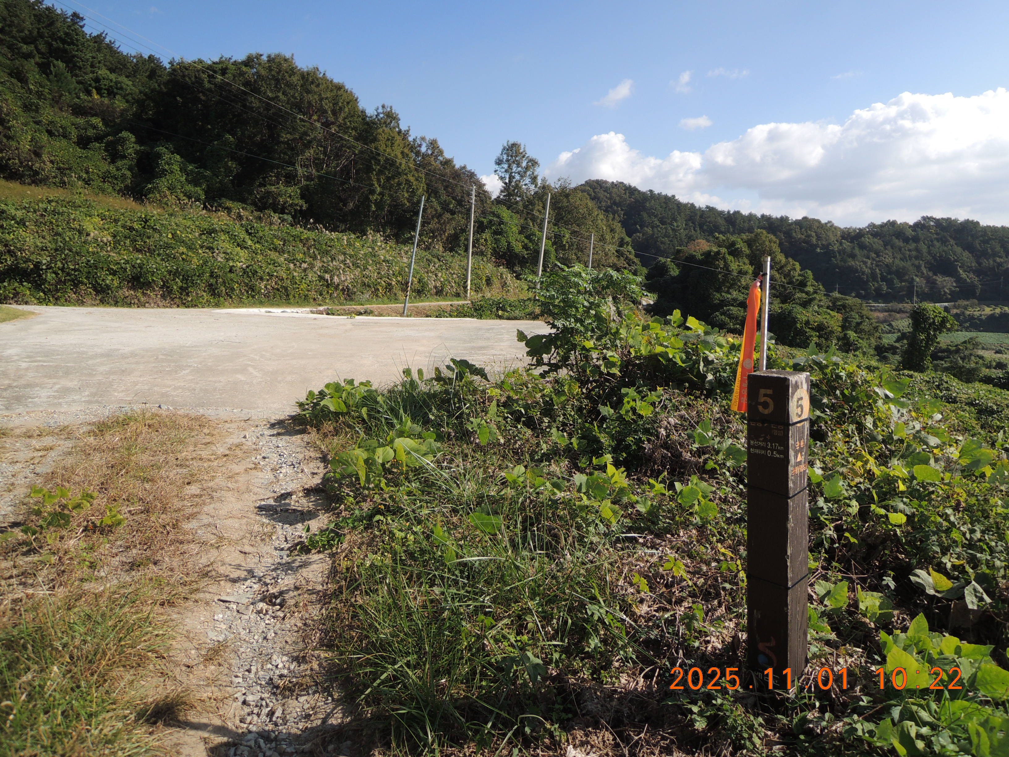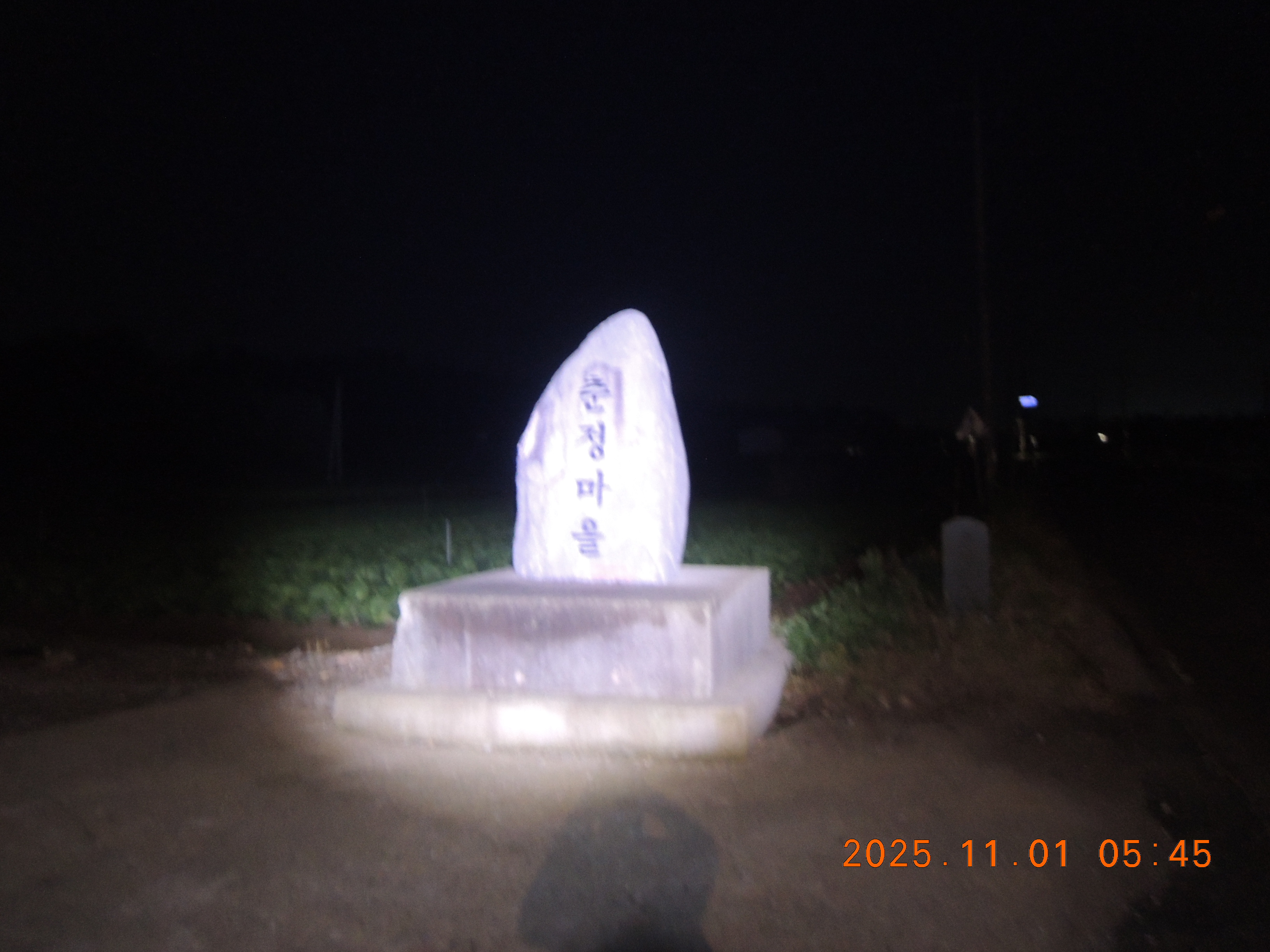 -05:22 축사 전, 이정목 우측으로 꺽어 농로시멘트길 수로다리 건너 진행.