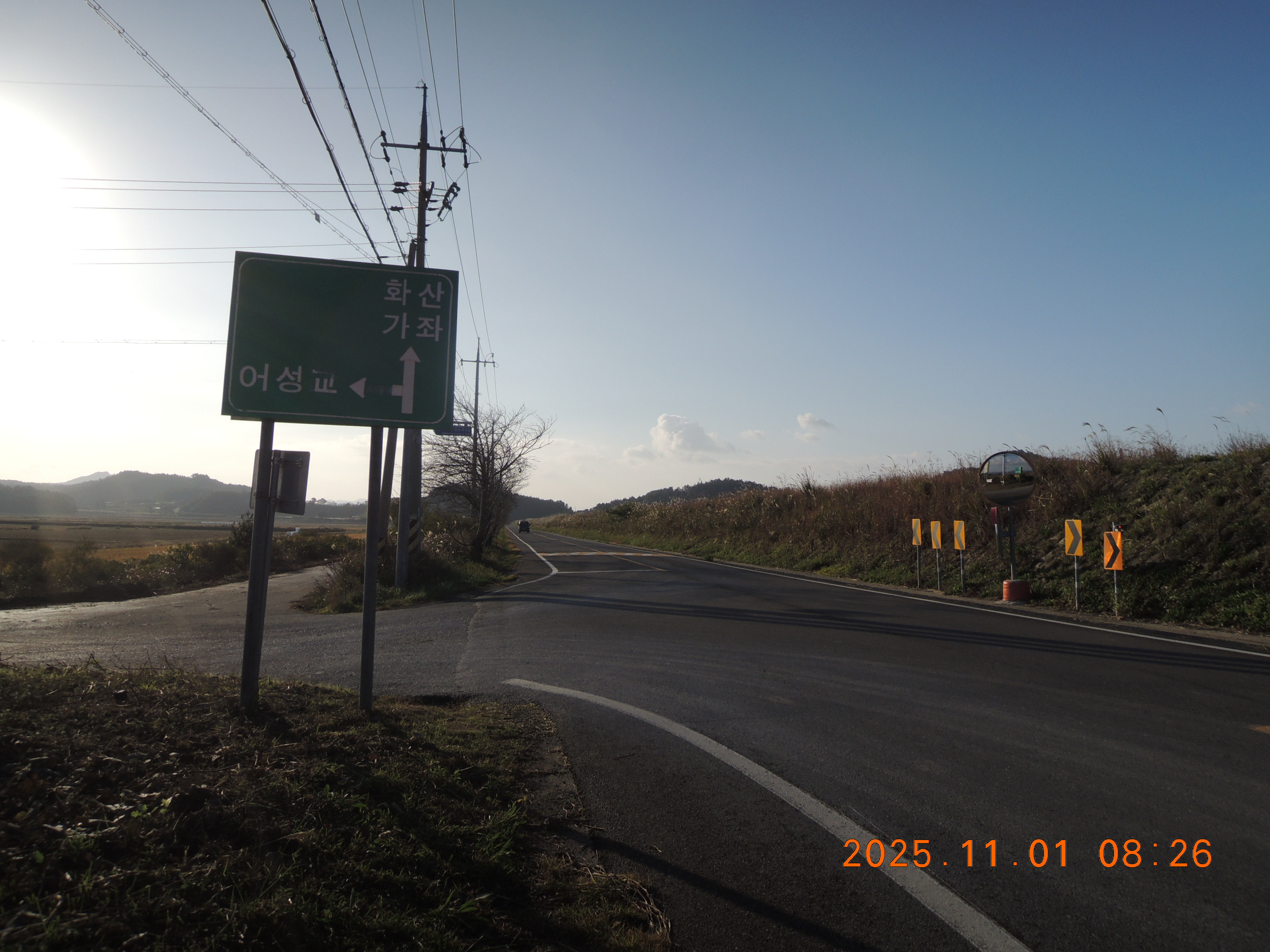 -07:37 좌측 새우양식장을 보며 77번도로 합류, 이정표 →고천암자연생태공원 방향으로 우회(이정표 잘못됨) 도로건너 농로길로 직진해야함(우회 했다 되돌아 옴)