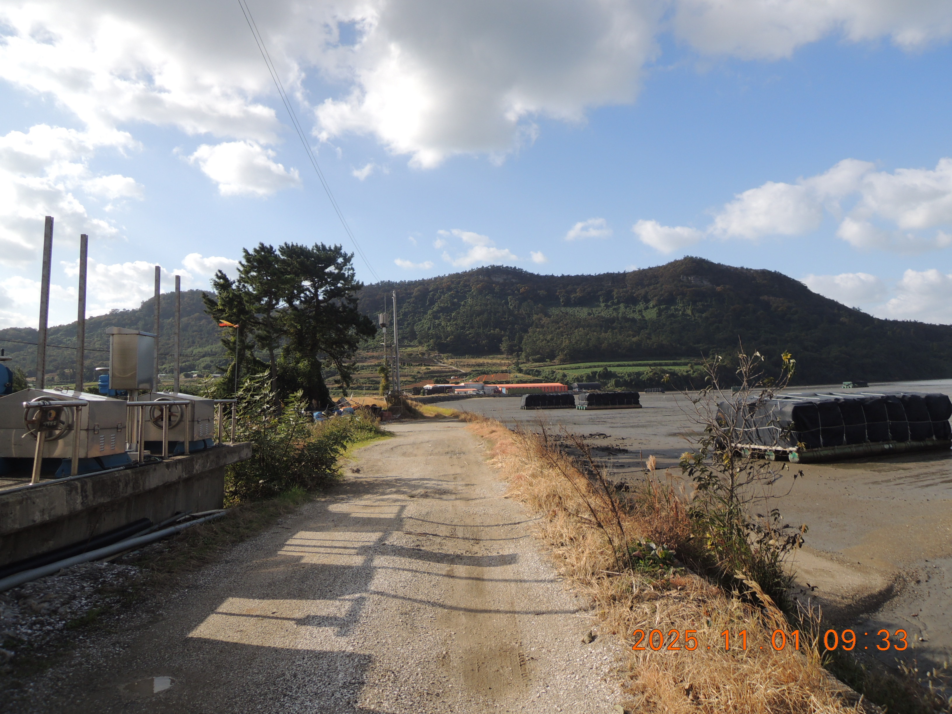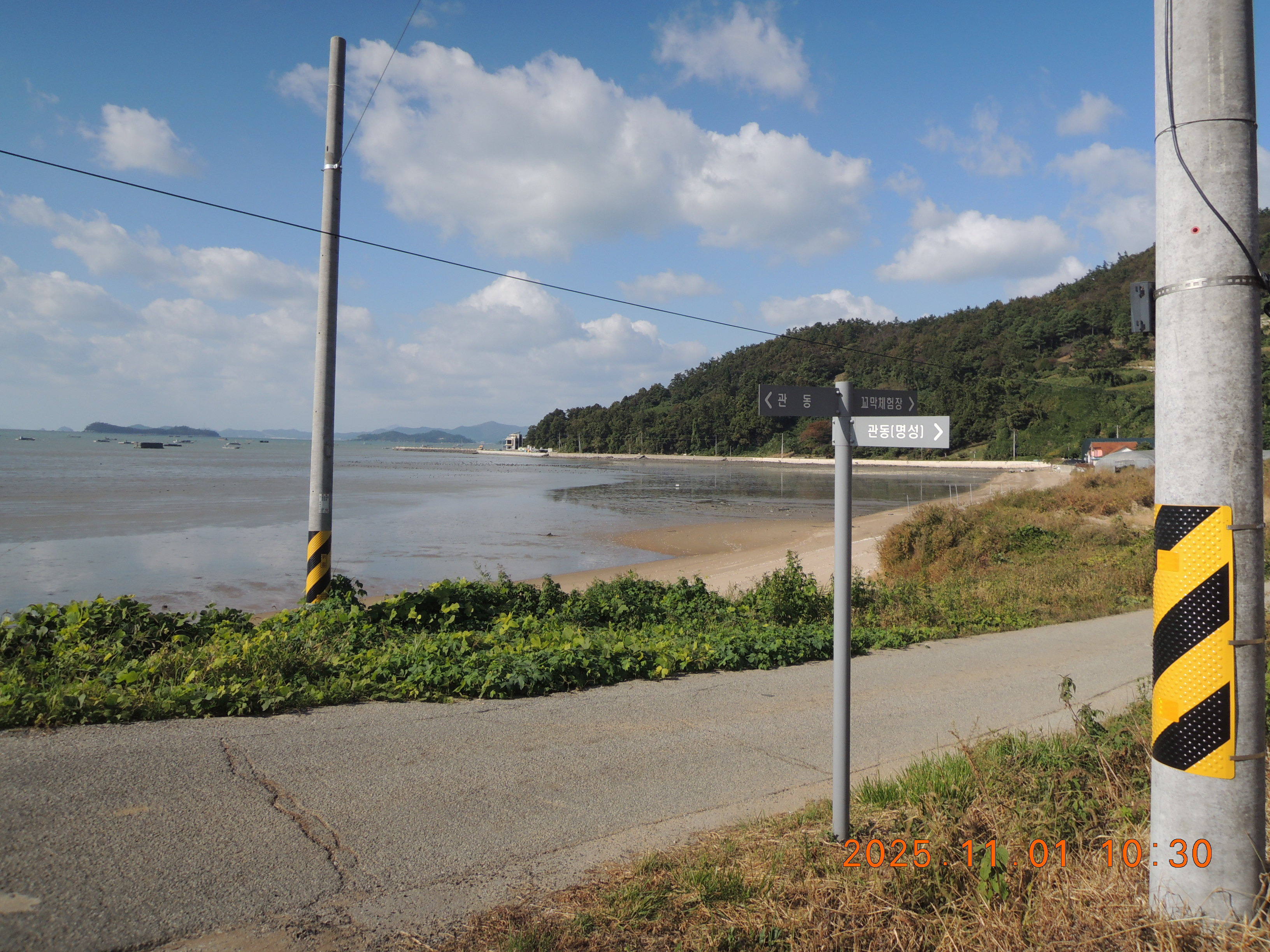 -09:33 명성마을 해변제방 진행하다 좌측 농로길로 진행후 관두산을 보며 우회