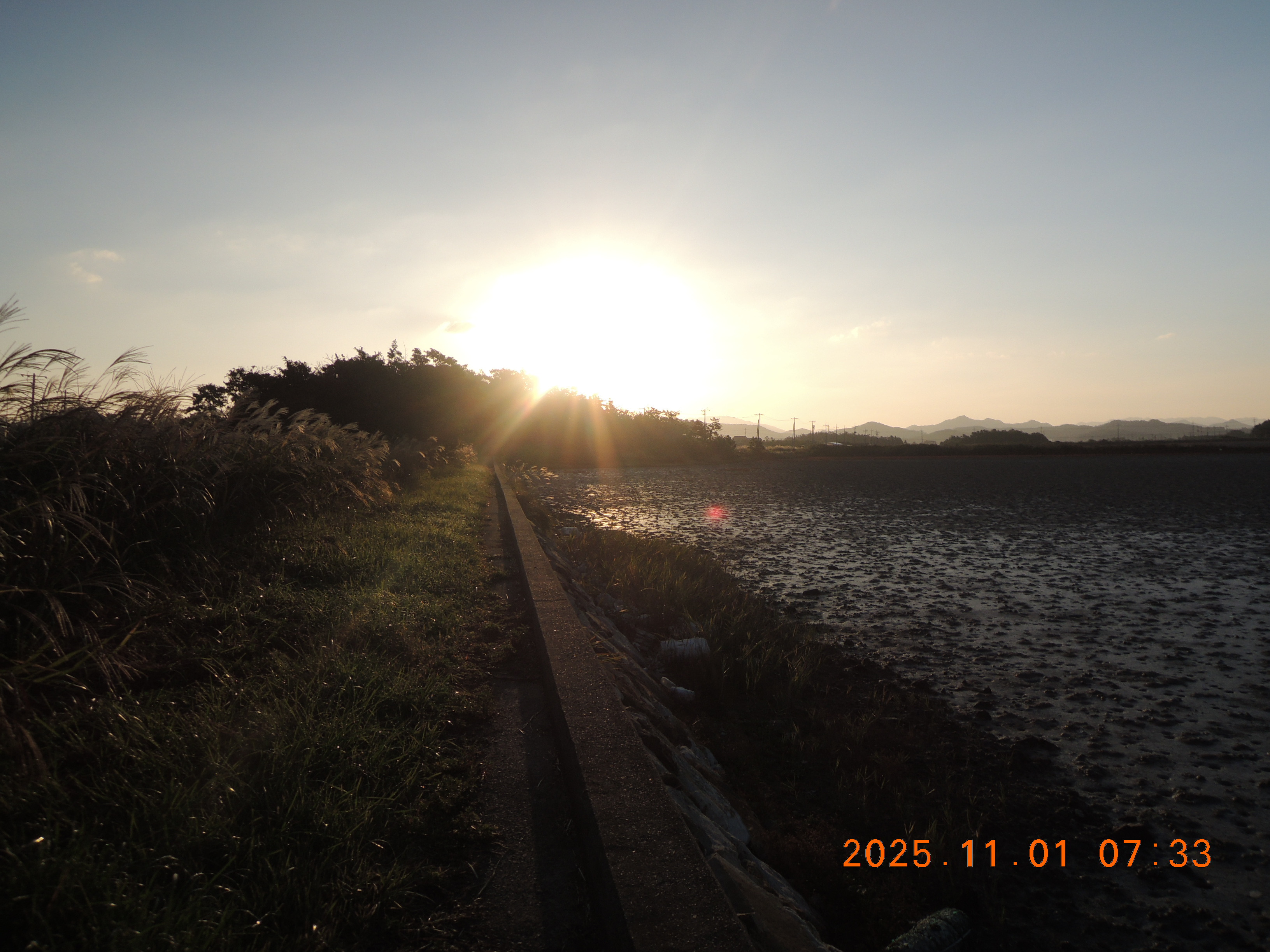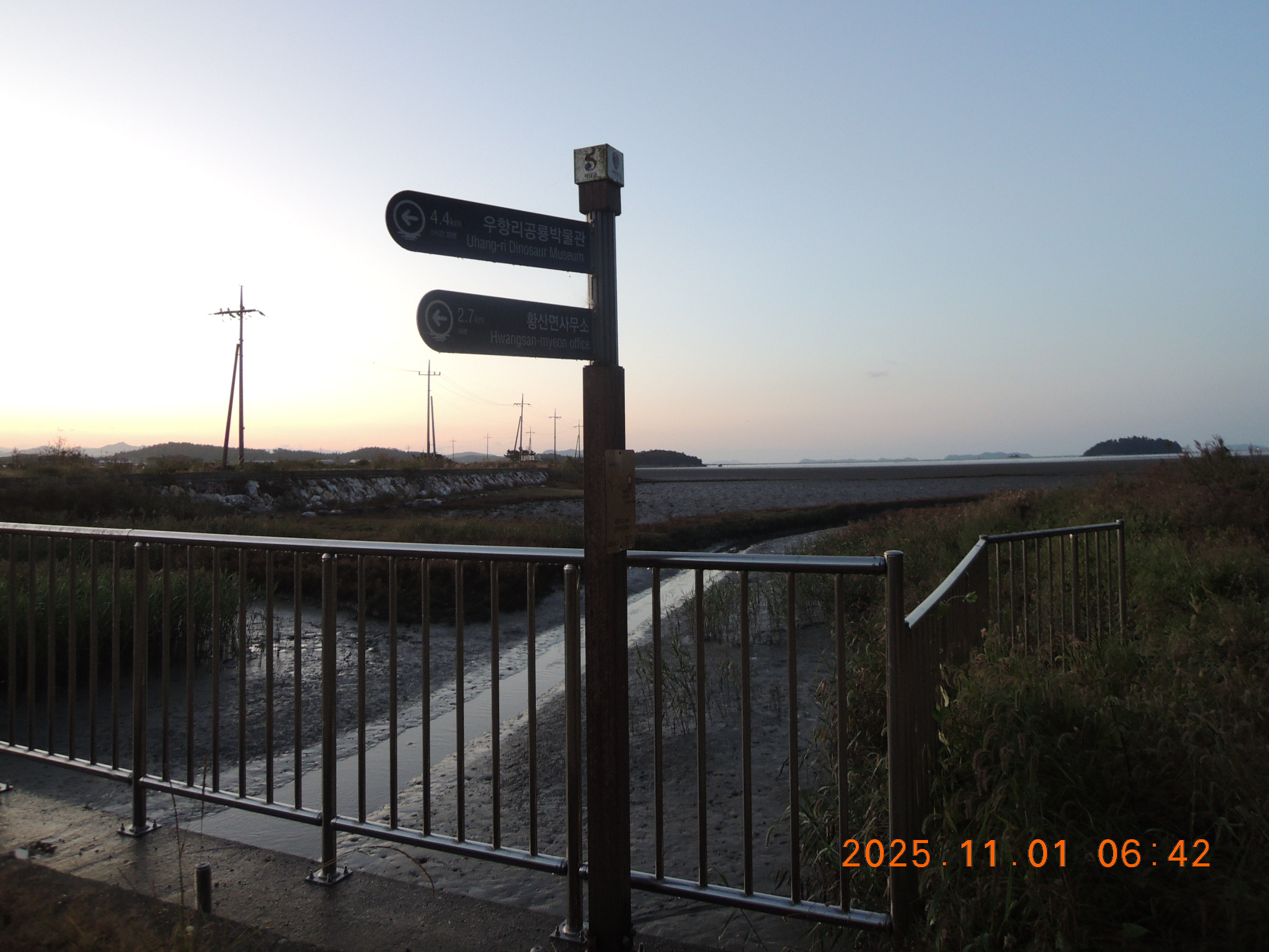 -07:13 ┣길 삼거리, 이정표 →고천암자연생태공원 4.5Km방향 우회, 조금전 일출.