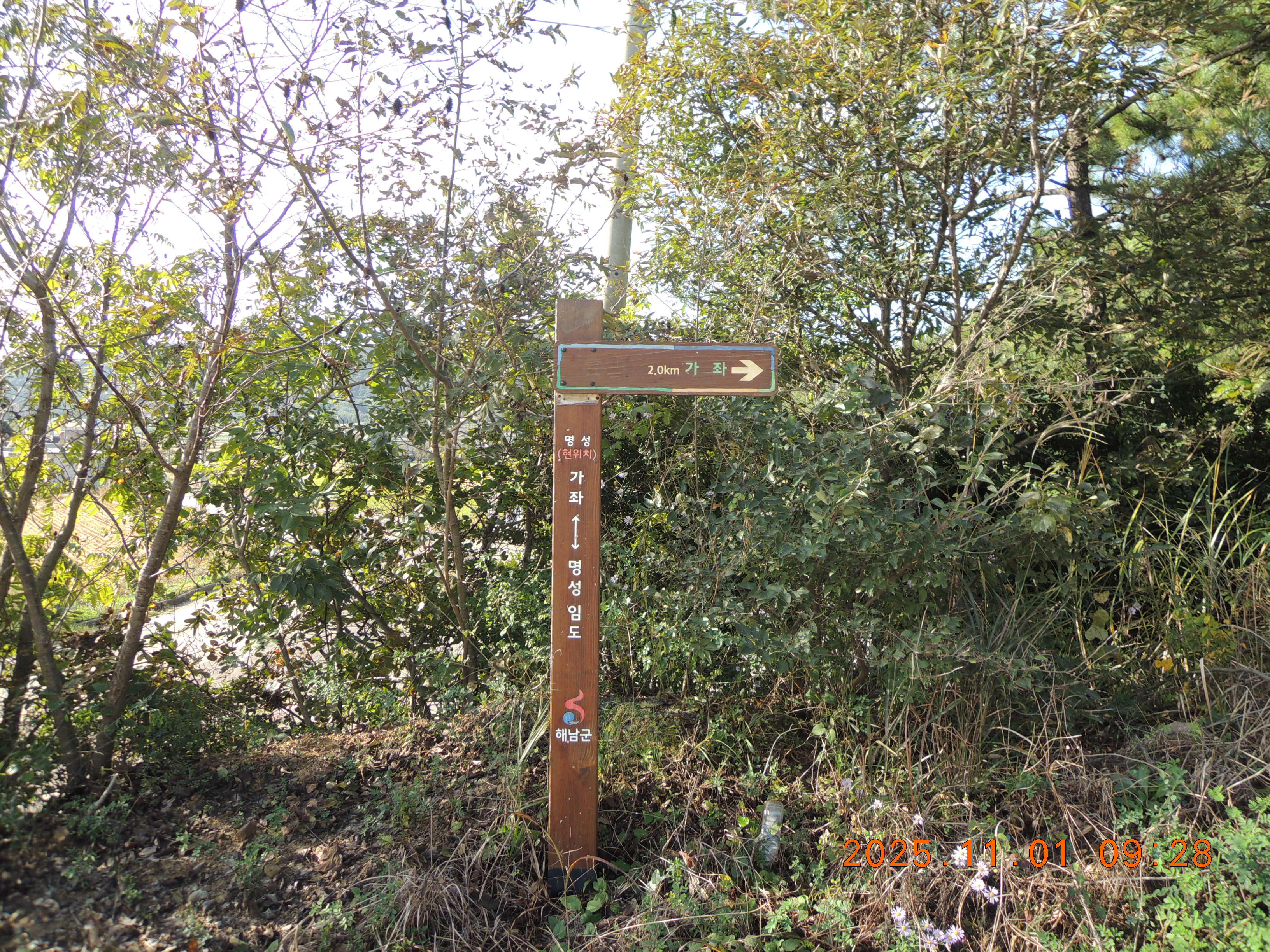 -09:28 임도끝 안내판,이정표 가좌-명성임도, →가좌 2.0Km, 관두산 2.2Km,명성마을표석.