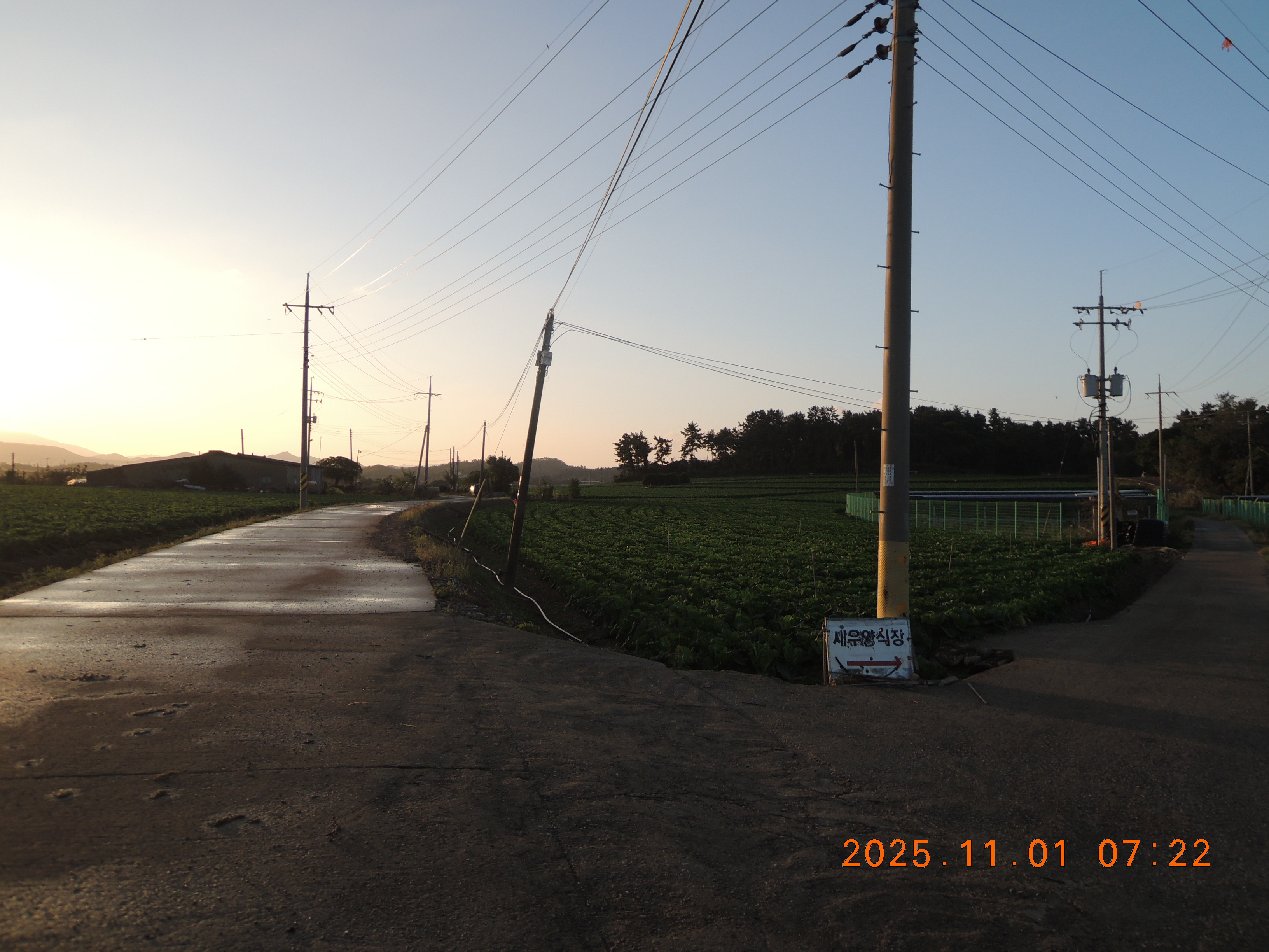 -06:22 이정목 지나 초월리마을 우측으로 진행. 서서히 동이 트이면서 땅끝기맥 두륜산등 조망하며 배추밭 농로길로 진행.