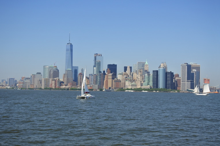 허드슨 강에서 본 맨해튼의 빌딩 숲.9.11 테러가 났던 곳에 on E WORLD TRADE CENTER 우뚝 솟아 있다