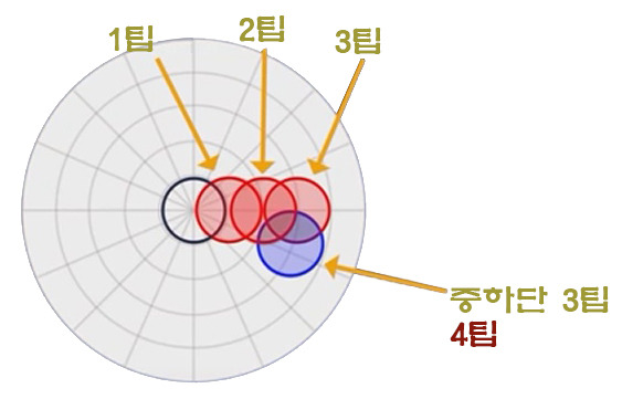 반대로 정상적인 각도보다 길게 형성된 경우라면 충분한 회전이 작용할 수 있도록 속도를 줄이고 회전량이 극대화 되는 4팁을 주게 되면 각은 일반적인 각도 보다 길게 떨어져 득점이 가능해진다.