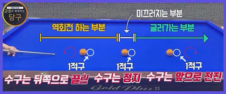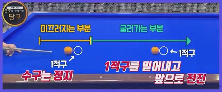 미끄러지는 부분에서 1적구를 정면으로 만나면 수구는 멈추게 된다. 하지만 굴러가는 부분에서 1적구를 만나게 되면 구름관성으로 인한 전진력으로 인해 1적구를 밀어내고 수구도 앞으로 전진하게 된다.