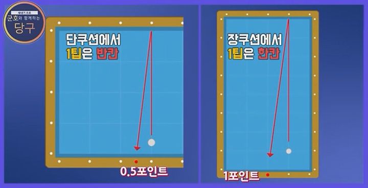 일반적으로 단쿠션에서 1팁은 반칸씩 이동하고 장쿠션에서는 1팁이 한칸을 이동한다고 알고 있다.