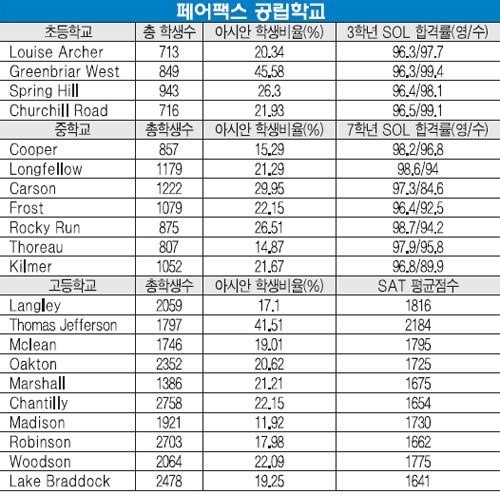 미국에서 12번째로 큰 공립학교인 페어팩스는 학생수만도 17만3000여명에 달한다. 이중 아시안 학생은 18.5%로 비교적 많은 편이다. 총 학교수는 초등학교(프리~6학년) 139곳, 중학교(7~8학년) 22곳, 세컨더리스쿨(7~12학년) 4곳, 고등학교(9~12학년) 21곳 등 197개다. 페어팩스 고등학생들의 SAT 평균점수는 1654점으로 워싱턴 일원에서 뿐만 아니라 전국에서도 우수한 학군으로 꼽힌다. 특히 고등학생들이 4년만에 졸업하는 비율이 91.2%를 차지했다.