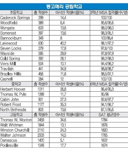 몽고메리는 전국에서 16번째로 큰 학군으로 총 학생수가 14만1000여명에 달한다. 현재 164개국에서 온 학생이 공부하고 있다. 이중 아시안 학생은 15.6%를 차지한다. 초등학교(프리~5학년) 131곳, 중학교(6~8학년) 38곳, 고등학교(9~12학년) 25곳 등 총 학교수는 200개로 페어팩스보다 많다.