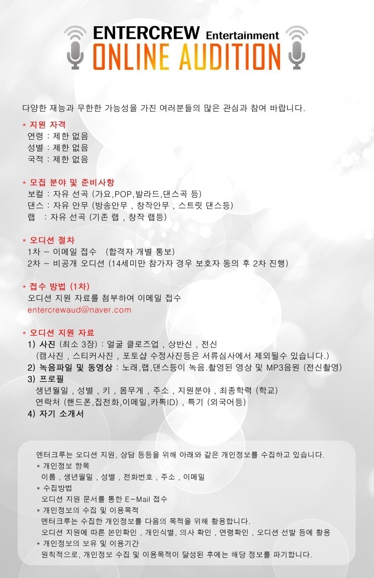 Entercrew 엔터테인먼트 가수 오디션 작성자entercrew|작성시간15.02.24|조회수50 목록 댓글 0 글자크기 작게가 글자크기 크게가 http://www.entercrew.com/bbs/board.php?bo_table=notice&wr_id=3 자사 홈페이지에서 지원서를 다운받아 작성후 오디션 자료와 함께 메일로 보내주세요. 다음검색 현재 게시글 추가 기능 열기 북마크 공유하기 신고 센터로 신고 댓글 댓글 0 댓글쓰기 답글쓰기 댓글 리스트
