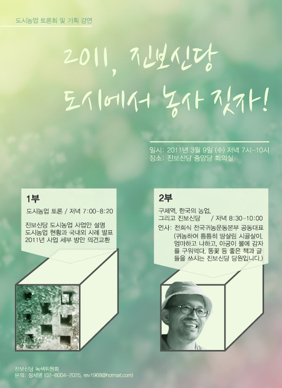 도시농업과 전희식 선생님 토론회에 초대합니다. 작성자장세명|작성시간11.03.07|조회수72 목록 댓글 2 글자크기 작게가 글자크기 크게가 다음검색 현재 게시글 추가 기능 열기 북마크 공유하기 신고 센터로 신고 댓글 댓글 2 댓글쓰기 답글쓰기 댓글 리스트 작성자꿈시 | 작성시간 11.03.08 잼나겠당~ 작성자장세명 작성자 본인 여부 작성자 | 작성시간 11.03.08 ㅎㅎ 오세요. 저희도 몇몇이 근교텃밭이나 개인적으로 하고 있던 상자텃밭 등을 좀 더 광범위하게 해보려구요. 저희가 머가 있어 교육한다기보단 서로의 경험 등을 나누는 자리로 생각하고 있습니다. 댓글 전체보기