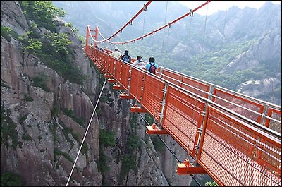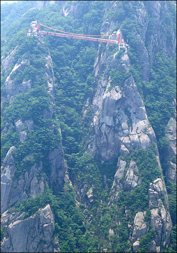 월출산 국립공원 구름다리는 기암괴석이 어우러진 매봉과 사자봉(510m)을 잇는 54m의 다리이다. 지난 5월 12일 땅에서부터의 높이 120m에 달하는 국내 최고 높이의 월출산 국립공원 구름다리가 건설되었다. 기암괴석의 비경... 호남의 소금강으로 불리는 영암 월출산