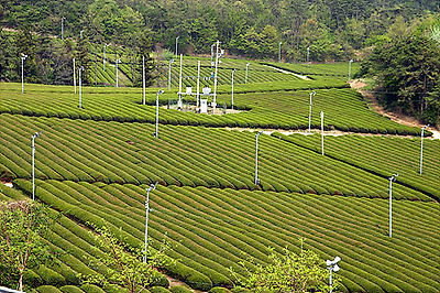 태평양 장원다원의 일렬로 늘어선 차밭과 서리방지용 팬이 어울어진 모습