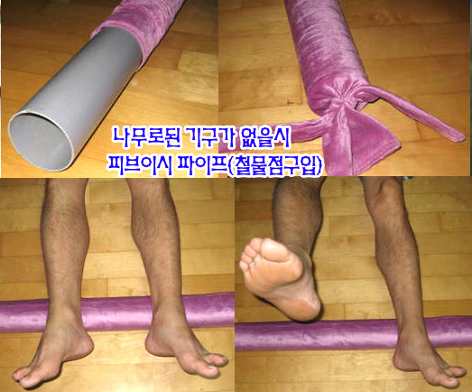 목베게의 높이는 5.5~6cm 정도 허리받침은 무건을 약간 말아서 3cm정도 그리고 발목을 펌핑할 반원형 나무토막을 준비해주는것이 좋다. 만약 나무토막을 구하기 어렵다면??