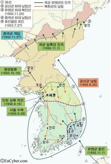 이와는 달리 북한은 통치체제를 빠르게 안정시키고, 남한 해방을 주창하며 같은 공산국가인 중국과 소련의 지원을 받아 꾸준히 군비를 강화 시킨후 중국과 소련으로 부터 남침 승인을 받은 후, 급기야 1950년 6월 25일 일요일 새벽 4시를 기해 38선 여러지역에서 일제히 북한의 남침 공세로 전쟁이 시작되었습니다.