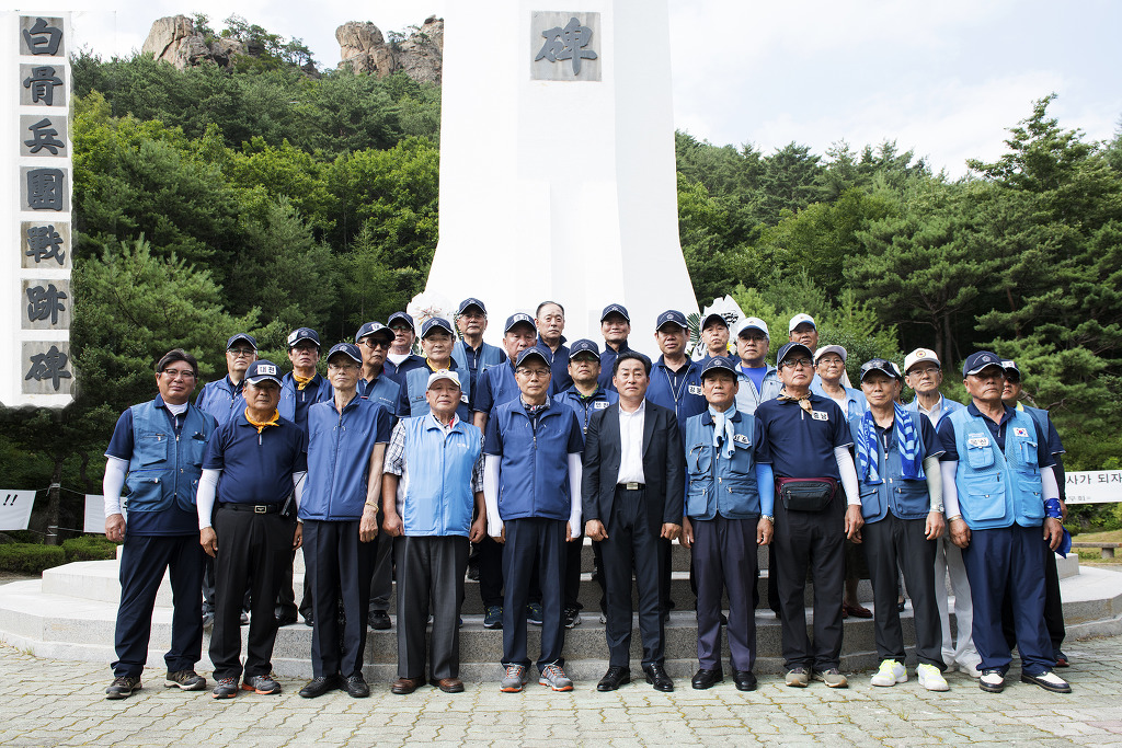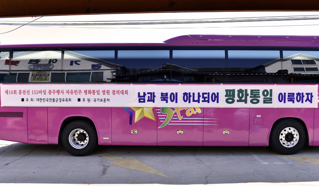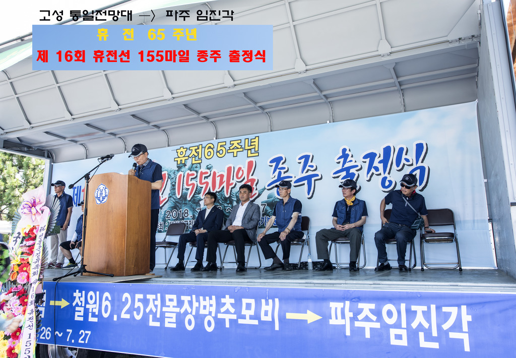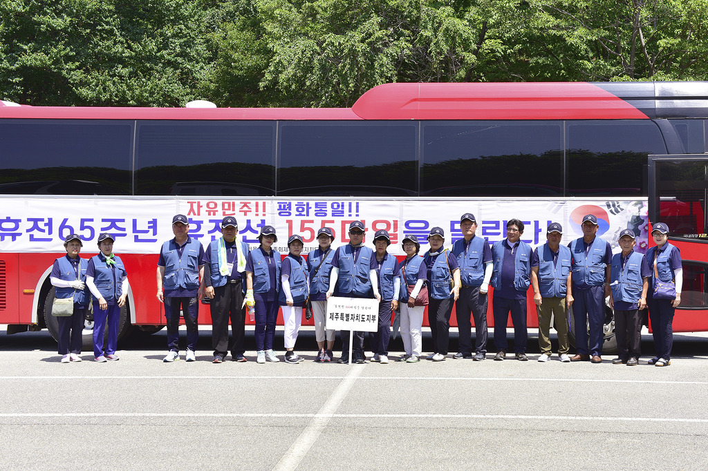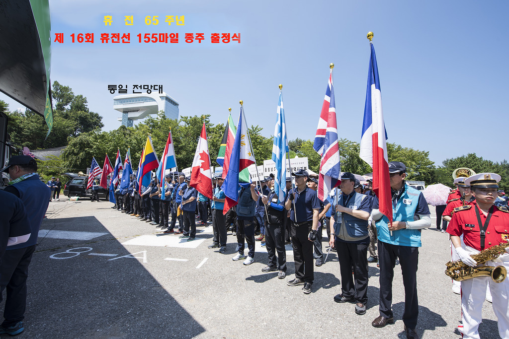 고성 통일 전망대에서 부터 임진각까지 155마일 종주 동행 간추린 기록 고성 통일전망대 행사장에 준비된 단상 트럭이 편리하게 되여있드군요. 6.26 참전국 국기를 들고계신분들 그 참전국의 고마움을 생각하시는듯 합니다. 해외? - 제주도에서 날아오셨네요! 멀리서 오셔서 올려봅니다. 화천 충혼탑 아래에서.
