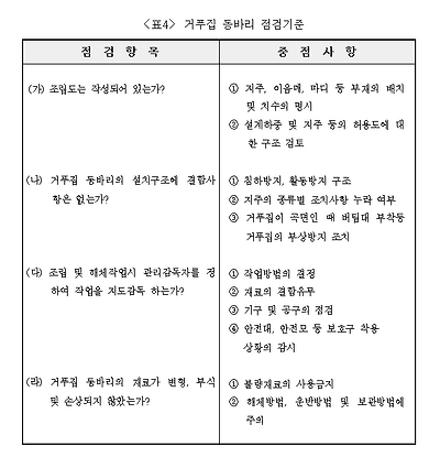 (11) 거푸집 동바리를 설치한 후에는 조립상태에 대하여 현장책임자가 다음〈표4〉의 점검기준에 따라 확인점검을 실시하고 이상이 없는 경우에 한하여 콘크리트를 타설하여야 한다.