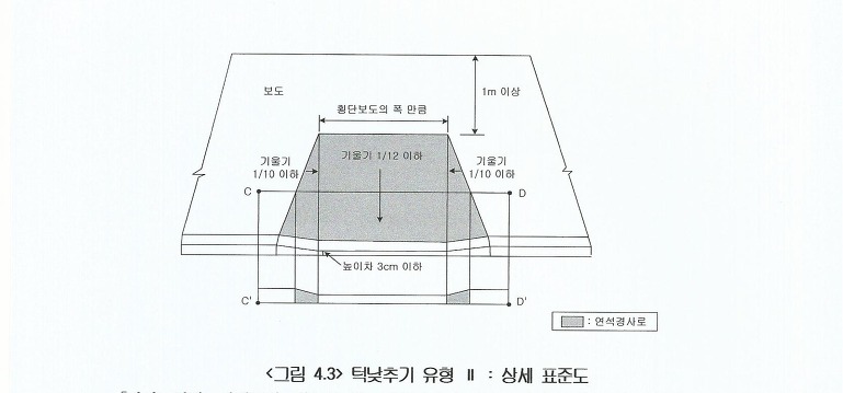 2)연석경사로의 기울기는 20분의 1이하가 바람직하며, 최대 12분의 1 이하로 한다. 유형 Ⅱ의 경우 경사로 옆면의 기울기는 10분의 1 이하로 한다.
