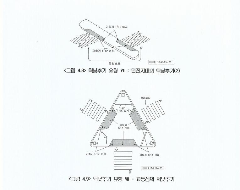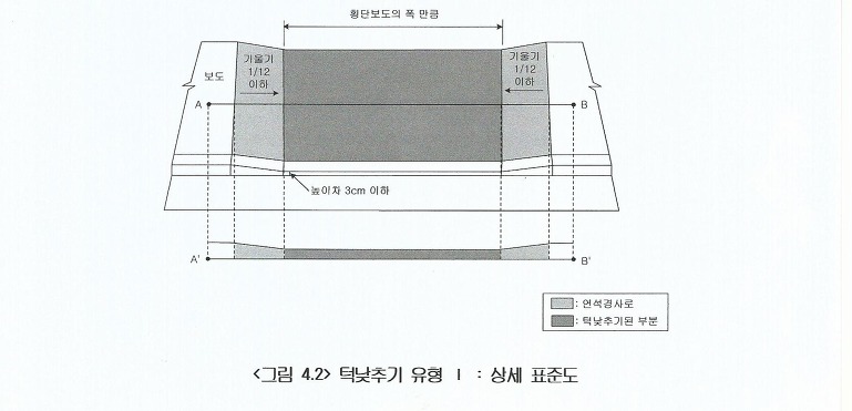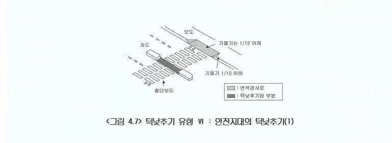 1)횡단보도 진입 지점이나 횡단보도 중앙에 설치된 안전지대 등에 보행횡단할 보도와 차도의 높이차를 줄이기 위해 턱낮추기를 실시한다.