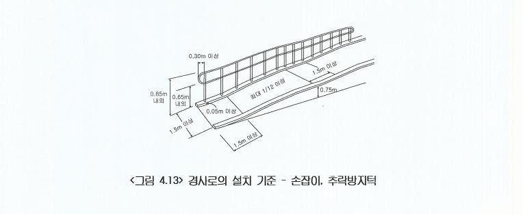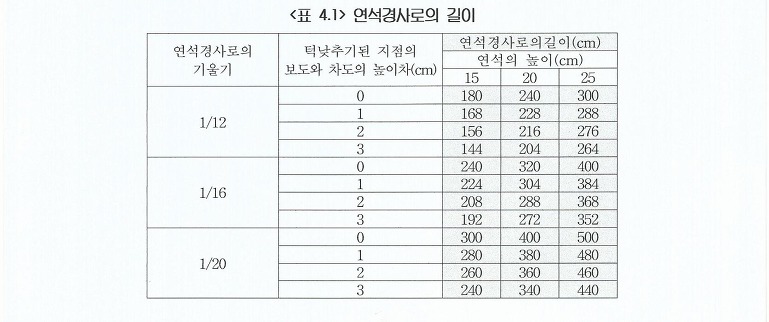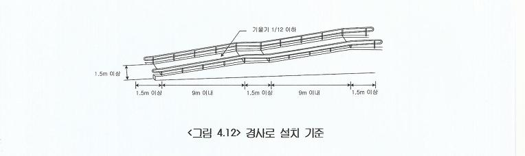 경사로의 최대 기울기 1/12는 최대 허용치로 넘어서는 안될 한계값을 의미하며, 이 기울기에 대해 실제 장애인들이 통행하는 데 많은 불편을 느낀다. 더우기, 우천시나 동절기 노면 동결시에 별도의 해빙 또는 결빙 방지시설 없이 도로에 설치하는 경사로의 기울기가 1/12이면 미끄럽고, 위험하여 통행에 지장을 준다. 그러므로 실제 도로에 설치하는 경사로의 기울기는 1/20 이하로 하는 것이 바람직하다. 그러나, 최대 수직 높이가 15.2cm 이하일 경우 1/10까지, 최대 수직 높이가 7.6cm 이하일 경우 1/8까지 경사로의 기울기를 완화할 수 있다. 그림 4.12는 경사로의 설치에 대한 기준을 도시하였다.