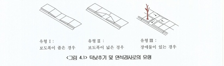보도에서 연석경사로의 폭을 제외하고 폭 1.0m의 평탄면을 확보할 수 없는 경우에는 ‘유형 Ⅰ’과 같이 보도폭 전체에 걸쳐서 턱낮추기를 한다. 보도폭이 넓은 경우, 즉 보도에서 폭 1.0m의 평탄면을 확보할 수 있는 경우에는 ‘유형 Ⅱ’와 같이 필요 지점에만 턱낮추기를 한다. ‘유형 Ⅲ’은 식수대나 기타 장애물 때문에 보도와 차도의 경계부에 연접하여 턱낮추기를 하기가 어려운 경우 적용하는 데, 그림과 같이, 보도 뒤쪽에서 ‘유형 I’과 동일한 방법으로 턱낮추기를 하여 연결한다.