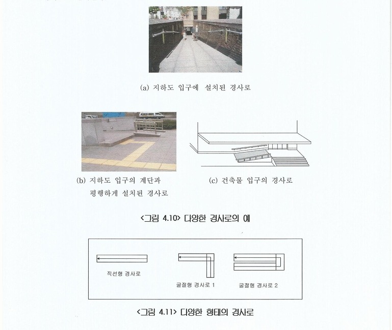 경사로에는 방향과 형태에 따라 여러 유형이 있다(그림 4.11). 직선형 경사로를 설치하는 것을 원칙으로 하나, 공간이 좁은 경우나, 기타 직선형 경사로 설치가 불가능한 경우 굴절형 경사로를 설치한다.