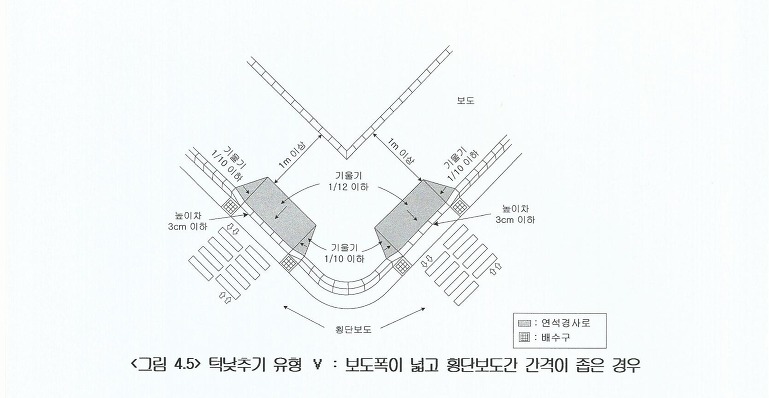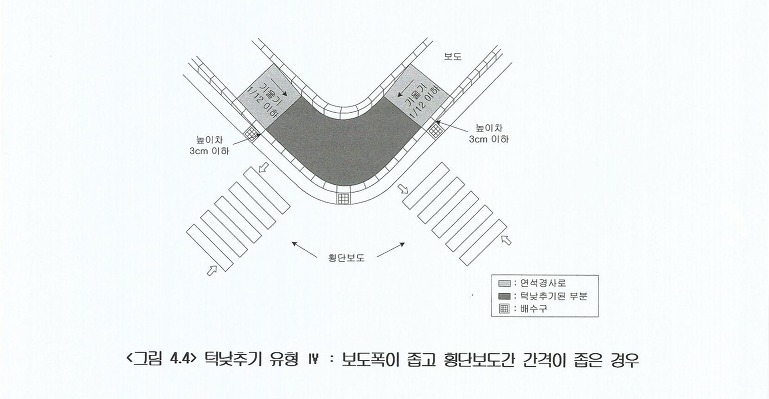 보도의 폭이 좁고 횡단보도간 간격이 좁은 경우 코너 부분에 턱낮추기를 하게 되면 평탄한 대기공간이 없고 우천시나 노면 동결시 휠체어사용자들에게 위험한 장애물이 된다. 따라서 이 경우에는 코너부분 진입 전에 그림 4.4의 유형 Ⅳ와 같이 보도 전체를 턱낮추기하여 문제를 해결한다. 턱낮추기가 된 코너의 보도와 차도의 높이차는 3cm 이내로 하며, 2cm 이하가 바람직하다. 특히, 유형 Ⅳ의 경우, 턱낮추기된 부분으로의 차량 진입 방지, 불법 주차 방지를 위한 시설을 설치할 수 있다.