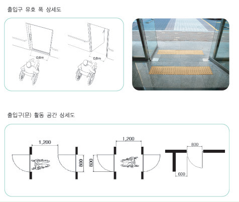 출입구(문)는 통과유효폭 0.8m이상으로 하여야 하며, 출입구(문)의 전면유효 폭 거리는 1.2m이상으로 하여야 한다. 다만, 연속된 출입문의 경우 개폐에 소 요되는 공간은 유효거리에 포함하지 아니한다. |