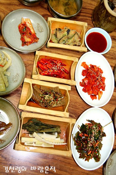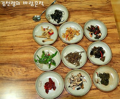 상의 오른쪽에 산나물이 놓여 졌는데, 특히 싸리나물(위에서 두번째 가운데)의 맛이 오묘하다.