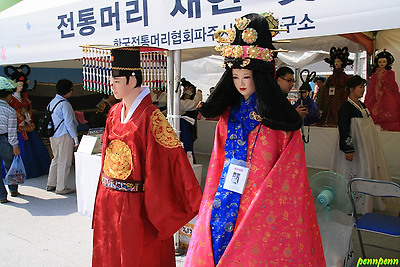 어느 가게 앞에 화려한 궁중의상을 입은 왕과 왕비의 모습이 눈길을 끕니다.