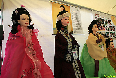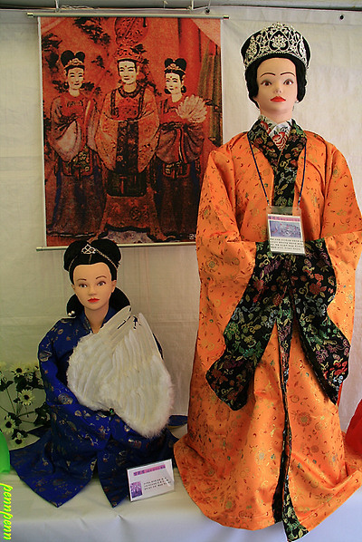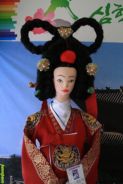 관람객은 주최측에서 준비한 옷을 입고 머리를 얹은 다음 발해 대인수 왕비(9세기/발해에 들어온 당나라 머리는