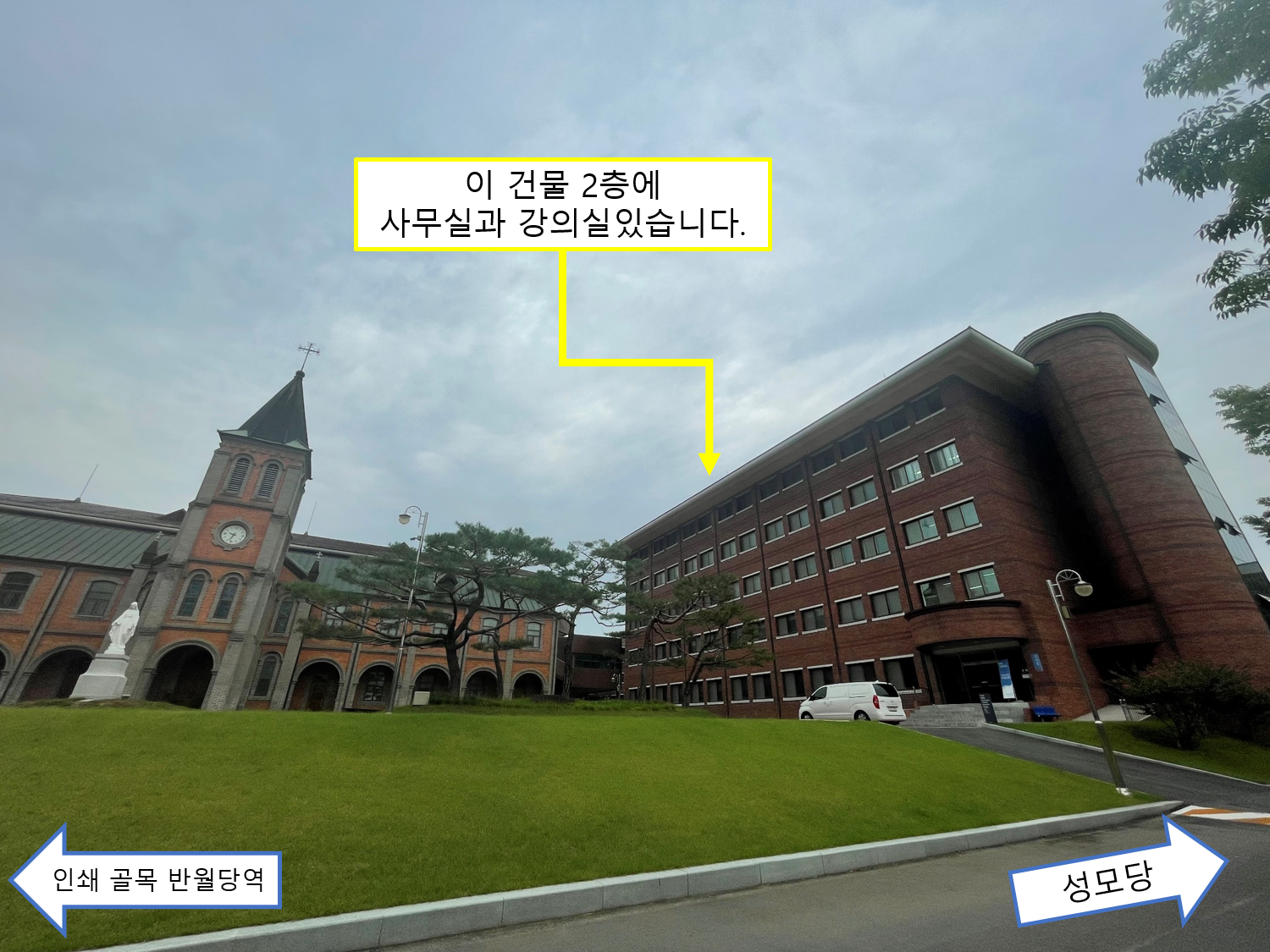 · 성모당 방면 : 성김대건 기념관 (동그란 체육관) 왼편 건물 2층입니다.