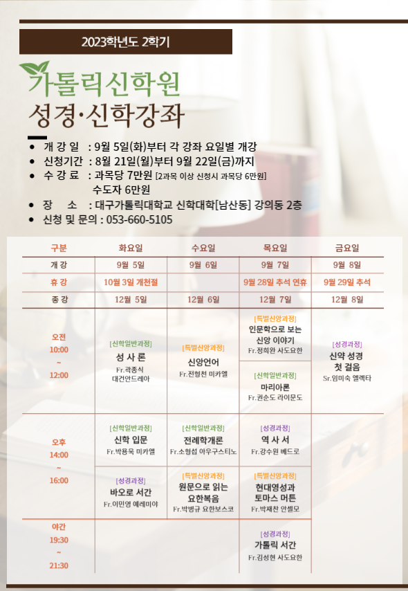 ※강의 시간은 대구대교구 사제 인사이동 및 기타 사정에 의하여 변경 될수 있습니다.