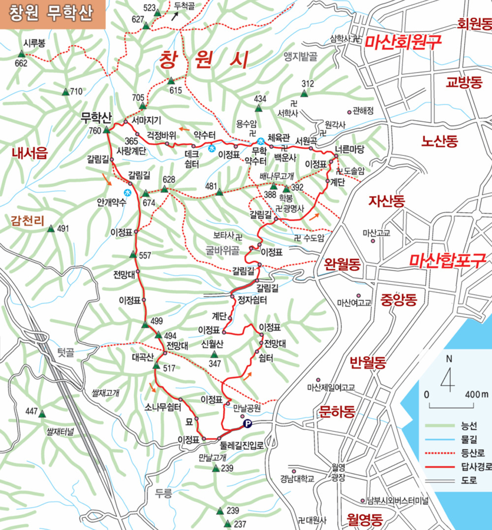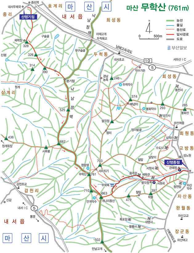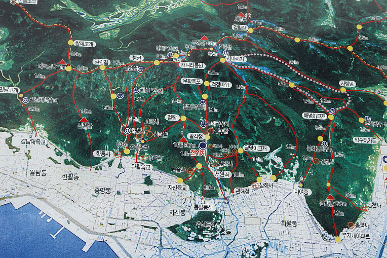 마산여중 - 앵지밭골 - 배넘이고개(마여중갈림길) - 서마지기 - 무학산 정상(761m) - 710봉 - 663봉 - 서원곡