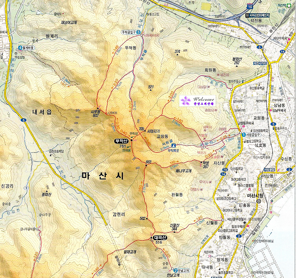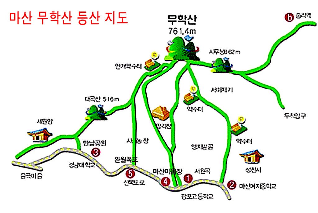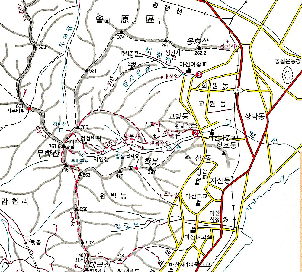 1코스 : 서원곡입구ㅡ 무학산기도원갈림길 ㅡ 학봉 ㅡ 중봉 ㅡ 안개약수터 ㅡ 무학산정상 ㅡ