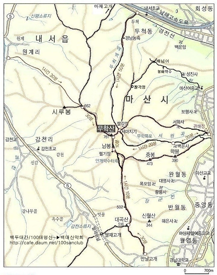산복도로 경남대육교 ? 만날재 약수터 ? 만날재 - 대곡산 ? 무학산 - 서마지기- 삼학사행시간 (3시간 )