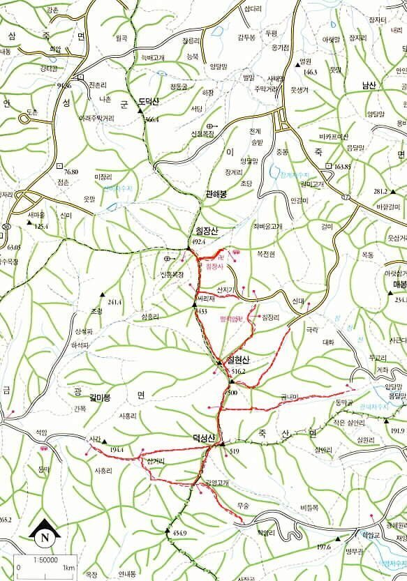 ♣ 경기도 안성군 삼죽면, 죽산면, 금광면에 위치한 "칠장산군"(덕성산,519m.칠현산516.2m, 칠장산 492.4m)은 백두대간 중 속리산에서 가지쳐 나온 정맥인 금북정맥에 속한 산이다. 높이는 높지 않지만 산의 폭이 크고 숲이 울창하여 그 일부는 안성시와 진천군의 경계를 이루고 있다.