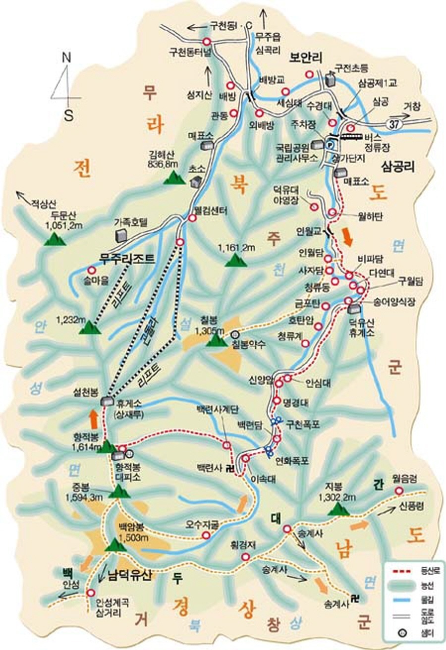 북동쪽 사면에서 발원하는 원당천은 깊은 계곡을 흘러 무주구천동의 절경을 이루며