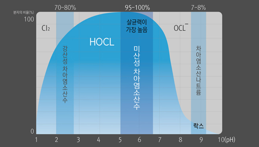 또 미산성 차아염소산수는 PH5~6.5일 떼 차아염소산이 가장 많아서 살균력이 가장 좋습니다.